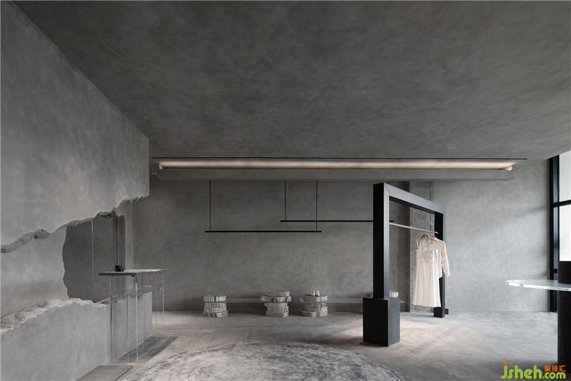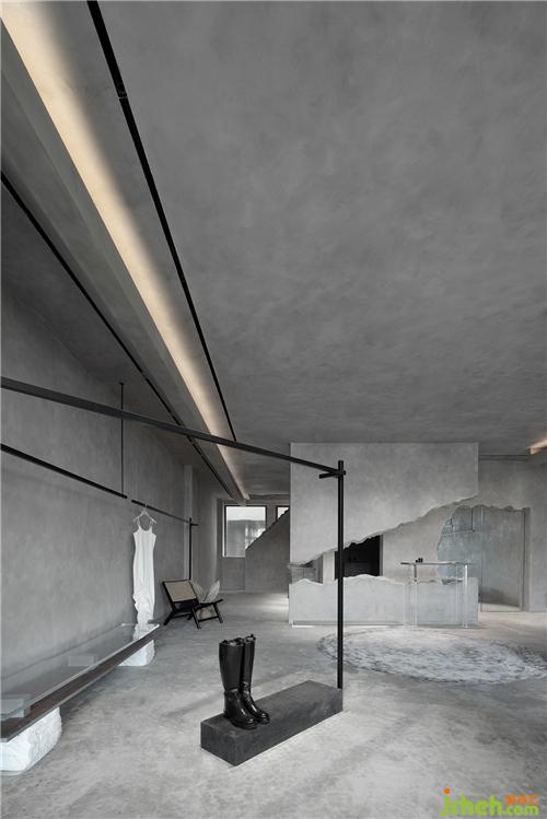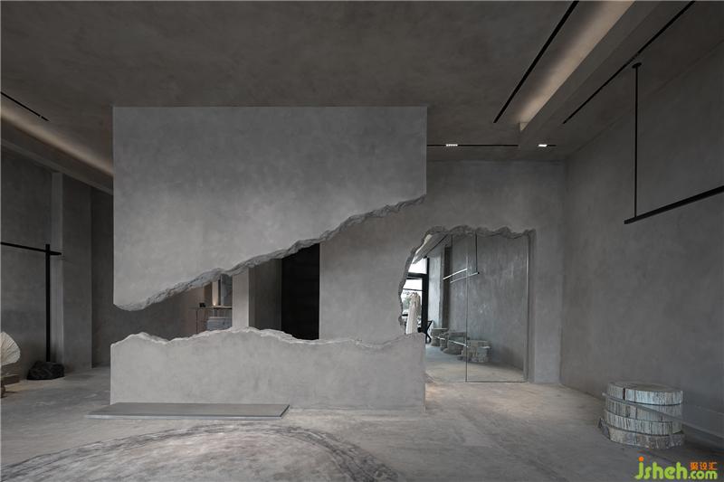 店铺装修设计设计师对空间的灵感来源是受到美国当代艺术家Daniel Arsham的未来考古风影响,在设计上保留原建筑效果,打造出开裂的墙壁,它在空间中表达出考古空间的同时,将一道道墙壁视作为阻挡,斑驳的墙体被一种牵引力肆意地撕扯,当连接着天花板和地板之间的墙壁裂开,泥石崩塌,另一个不同世界将慢慢呈现出来,仿佛这是一个开裂的废墟世界,也是空间与空间之间的交接间点。