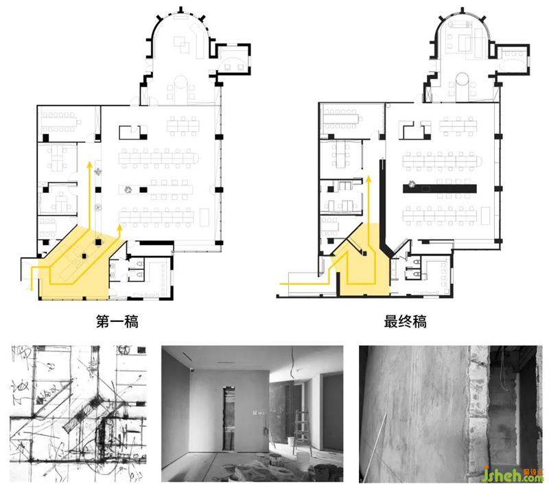 部分承重柱顶部为三角柱形状,天花板设计带来难度;