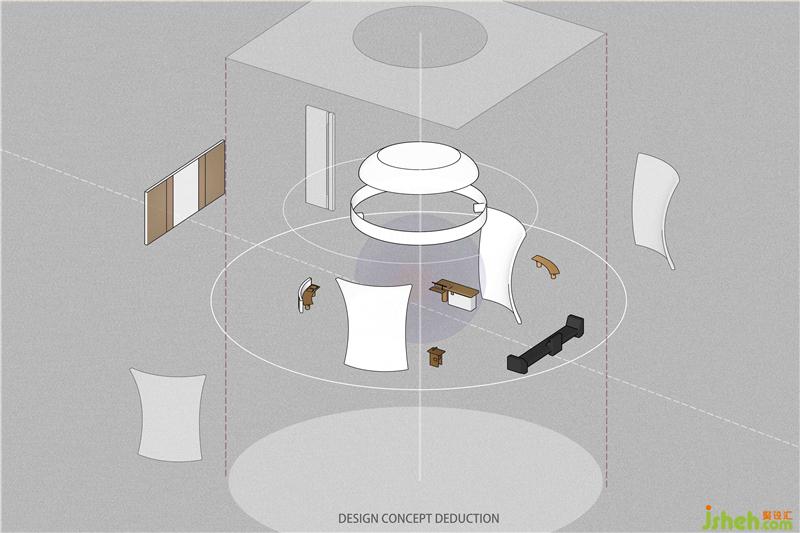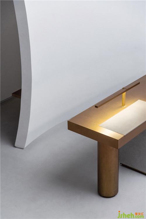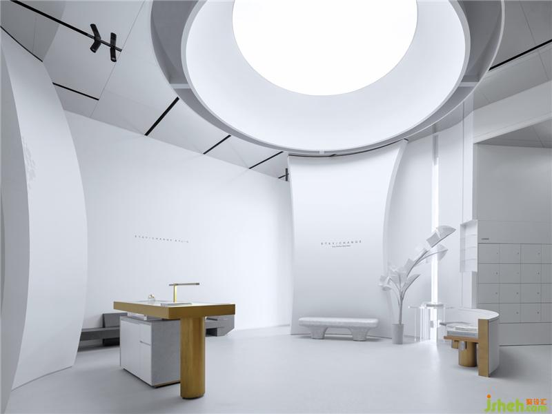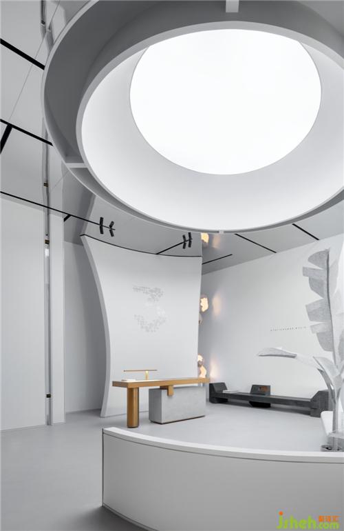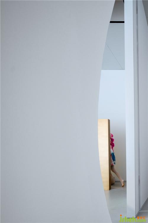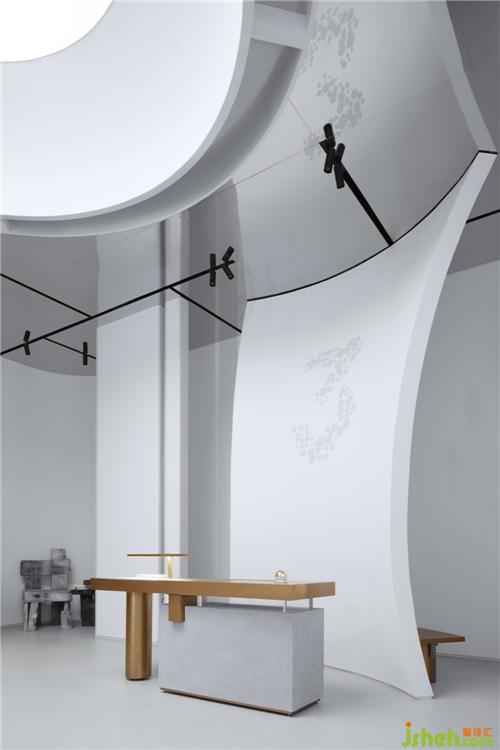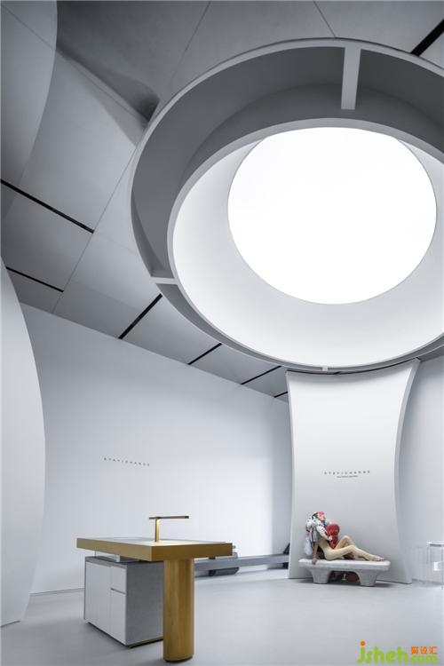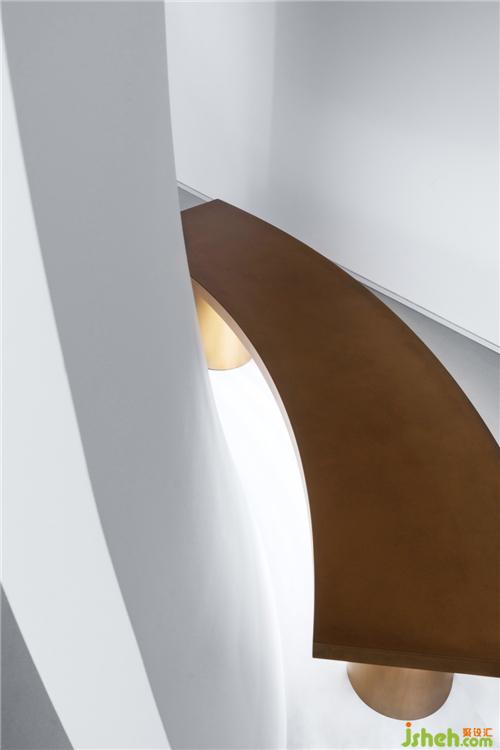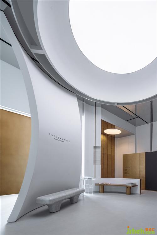 空间之间存在着感官上的节奏感,紧凑的,松弛的,流畅的,我们的空间感官被周围影响着。入口用柔和的弧线展示欢迎的姿态,等待观众投入它的怀抱。当我们从入口缓缓进入这个神秘的空间,谨慎的空间感官才被突然张弛开来,一紧一放之间带给人惊喜之感。