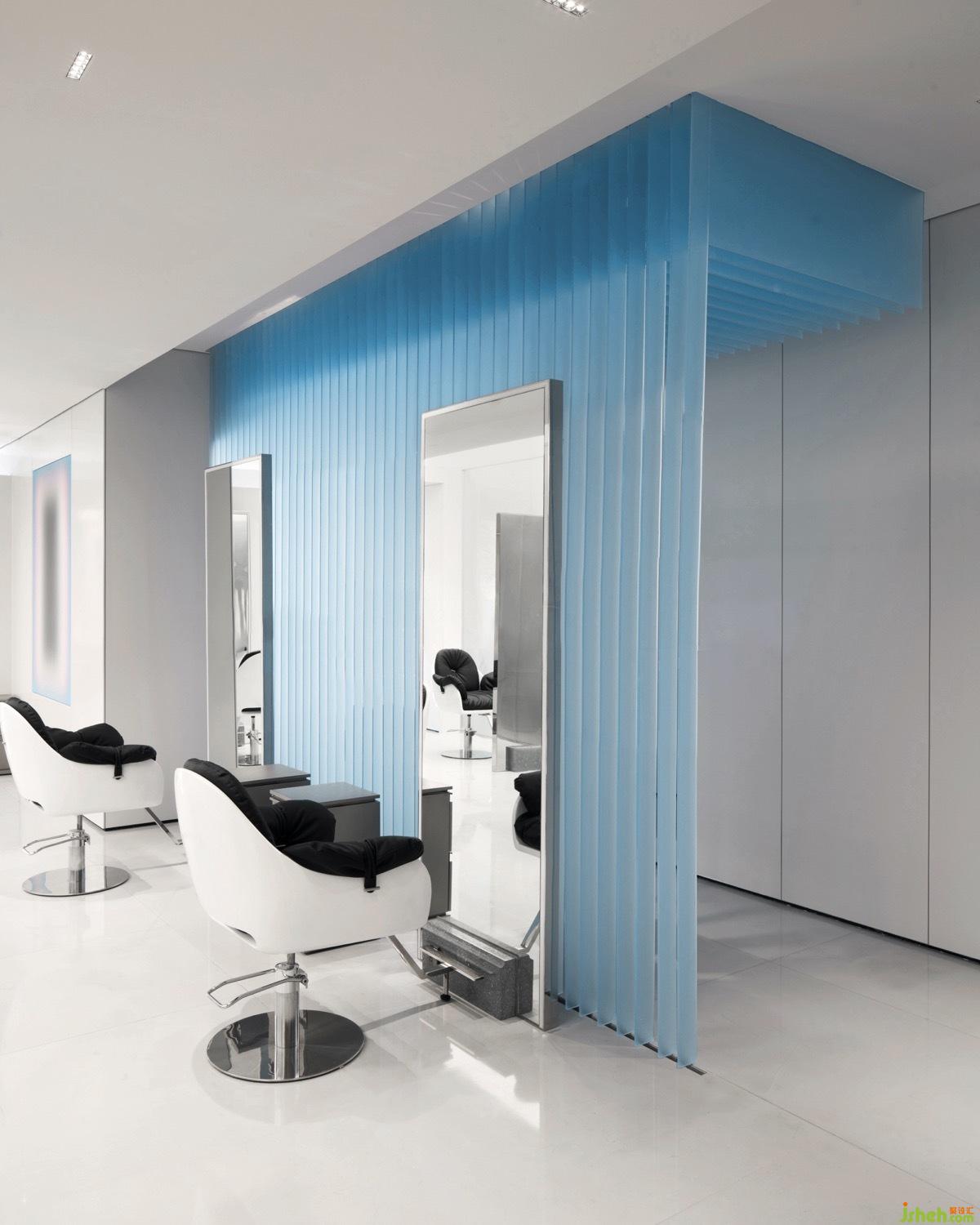 美发沙龙设计空间中选用朦胧神秘感的蓝色,以一种若隐若现的姿态,彷如神秘维度里的一束的光。拨开迷雾触摸光,空间被赋予层层递进的生命探索感,步入空间前区,不禁萌生好奇,充满艺术氛围的空间究竟承载着怎样的故事与用途?