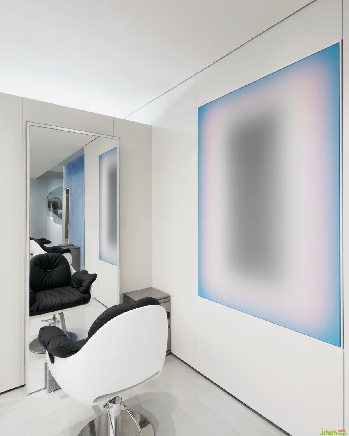 镶嵌镜面的天花得到了延展重合的空间线条,美发沙龙设计交织出虚实结合的空间,平静墙面因多重反射焕发出勃勃生机。天花镜面的添加实实在在打破了视觉障碍,让空间得以穿透,反射,延伸。空间的纵深感以镜子与墙面相接而开启,交错又承接。