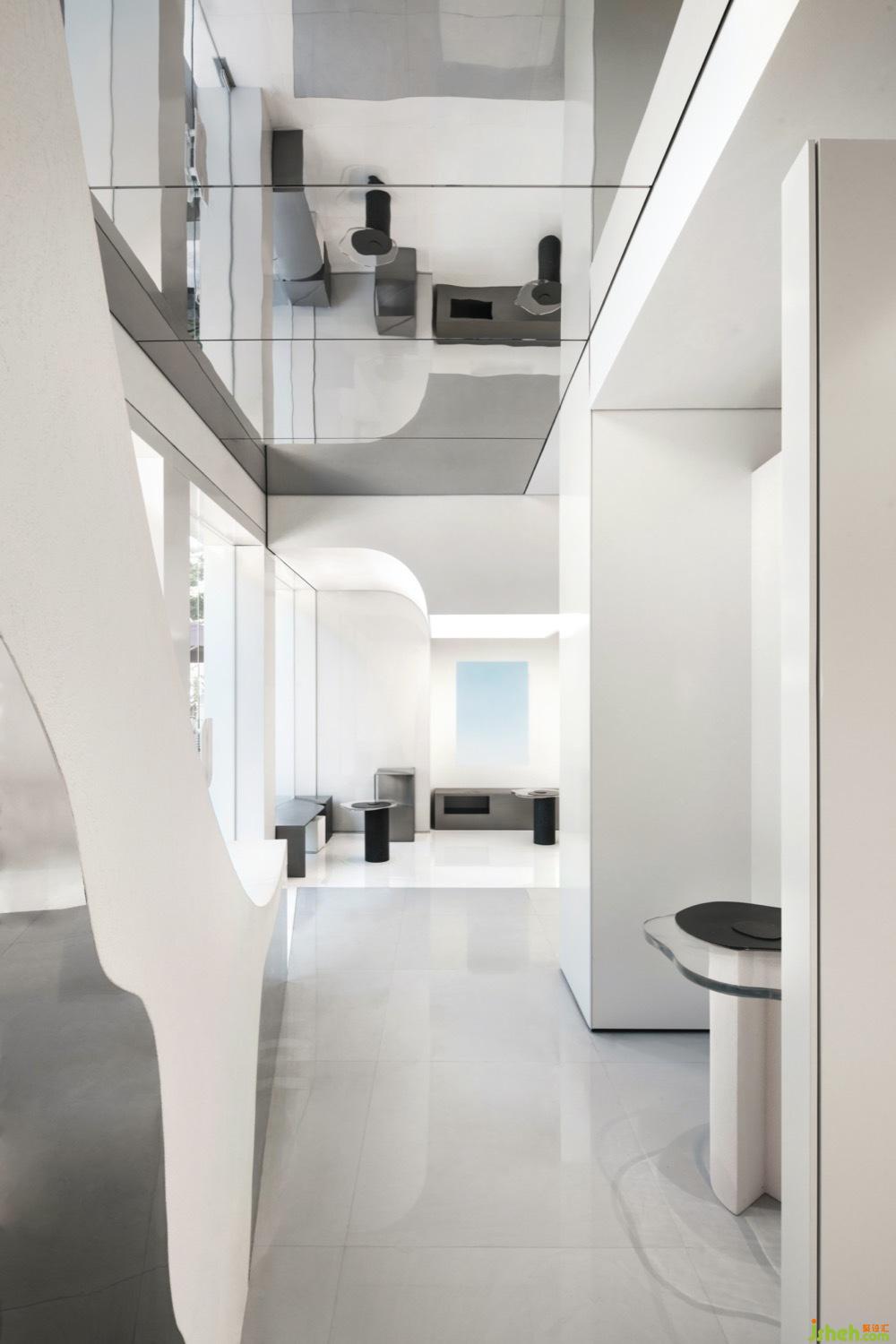 于屋外看,一个朦胧的引人探究的白色盒子安静地伫立着,每一个试图探索雾中光境的旅人因步步接触与走近而得到了答案和共鸣,不停地拨开迷雾,靠近光源,探索虚幻的维度,直到他们能够赶得上,碰得见。室内设计师