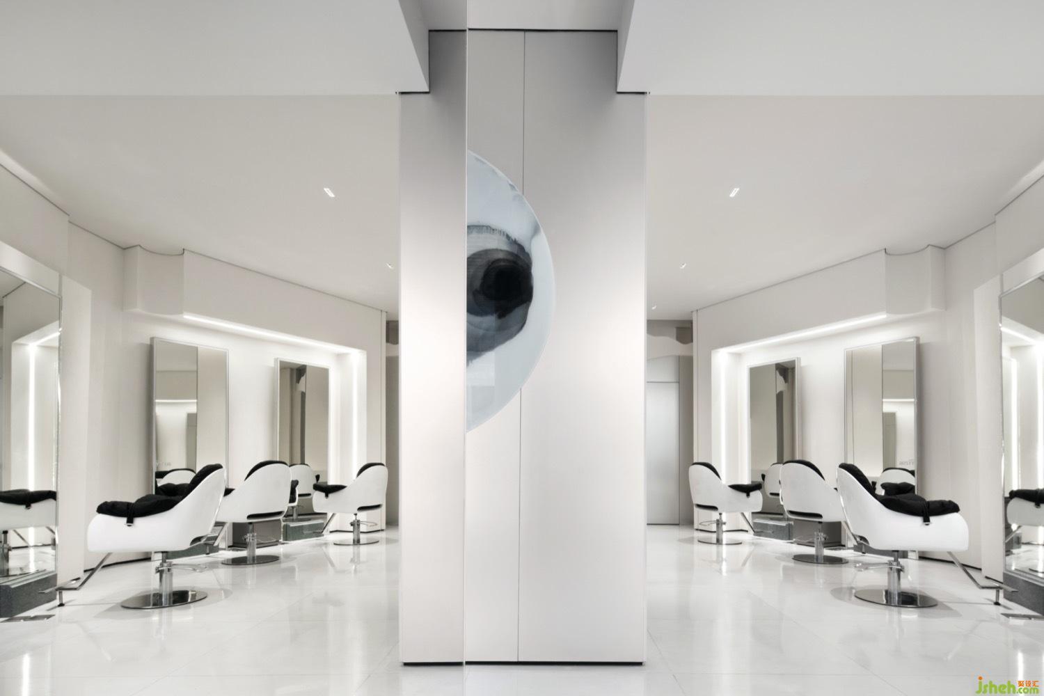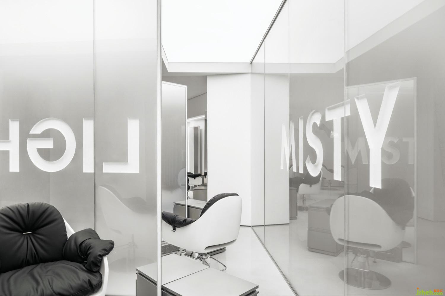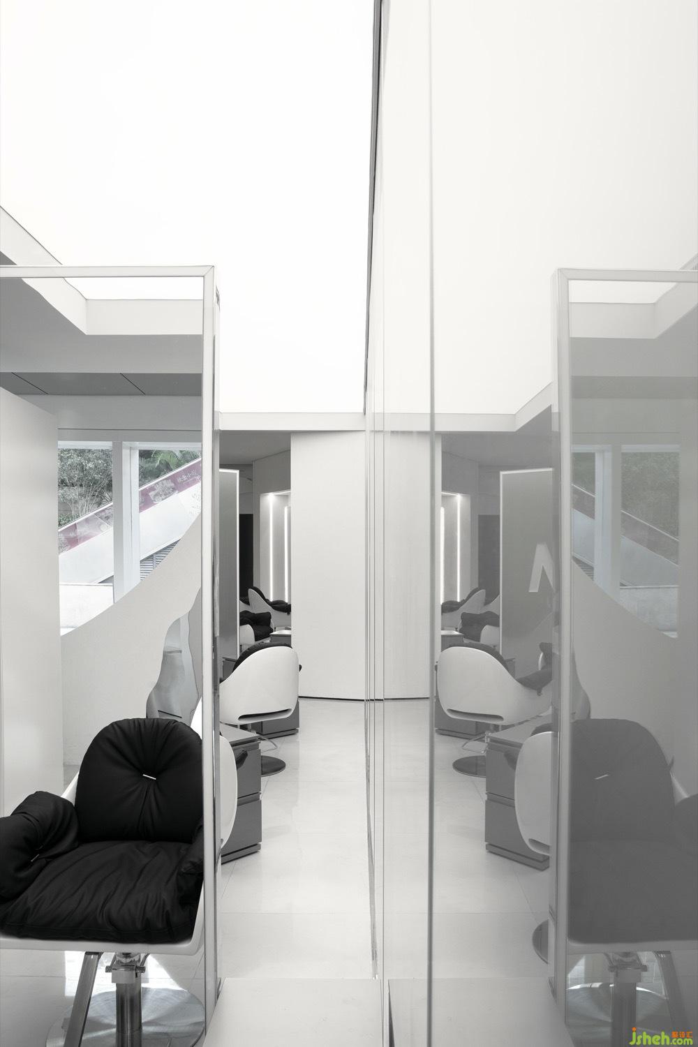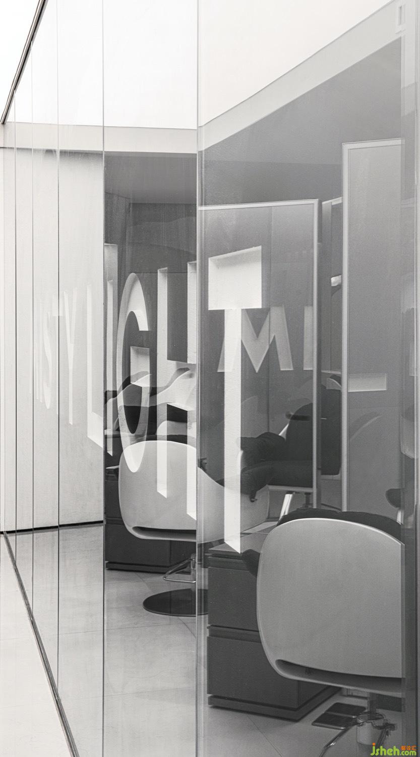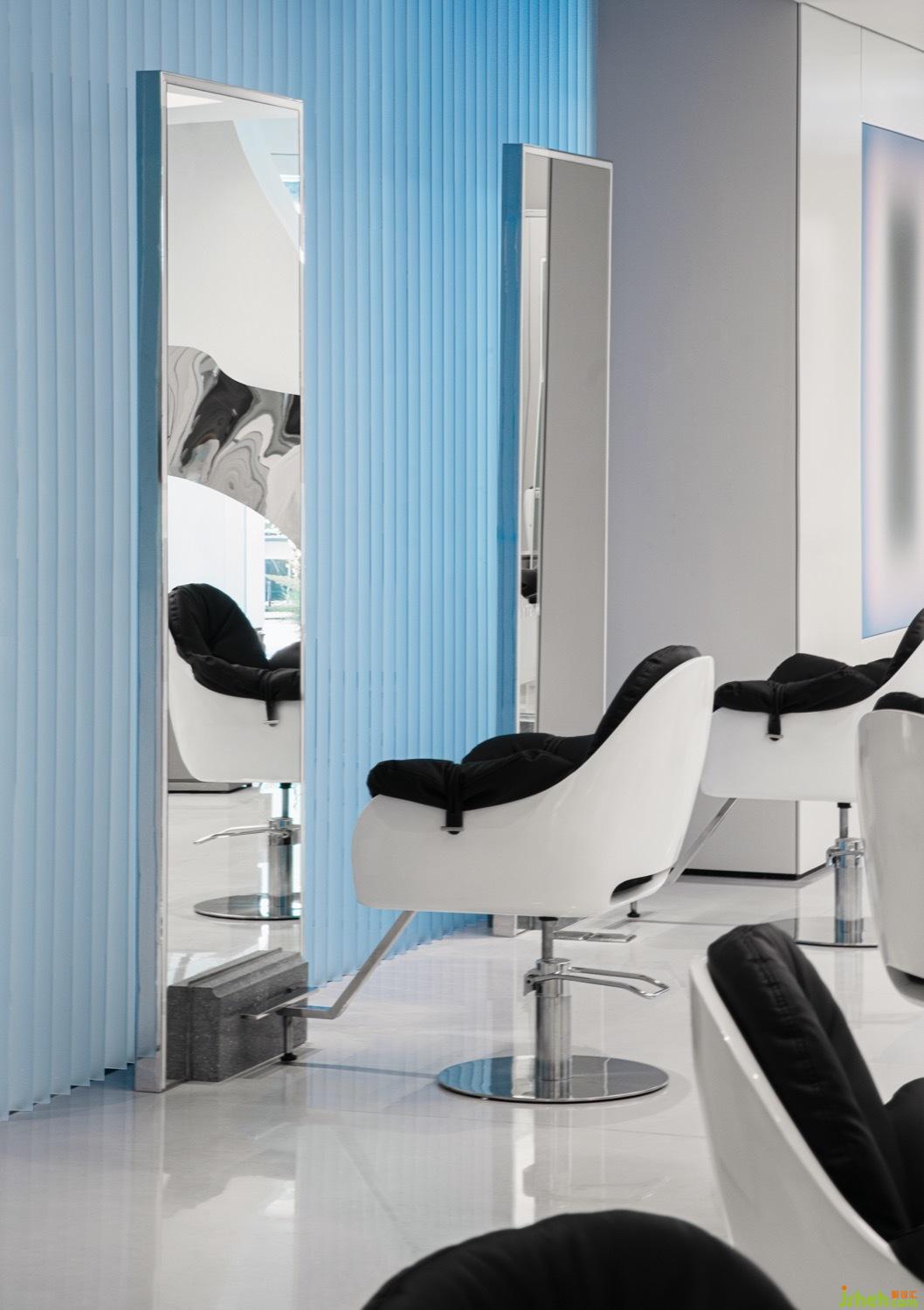 理发椅前选用的大面积方形镜子增强了空间的纵深感和空阔感,让打断的线条被重新链接起来,形成对立和平衡的“新”空间