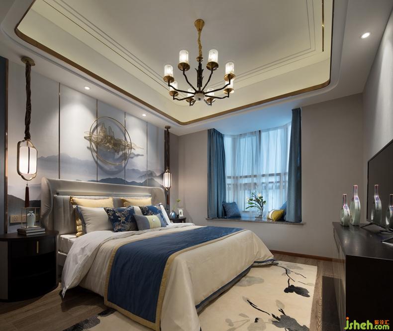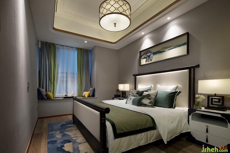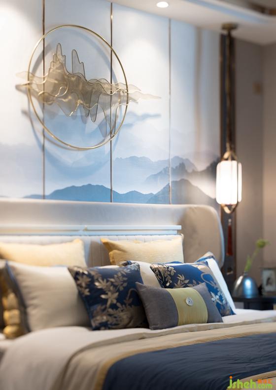 主卧延续新中式风格的淡雅意境,水墨勾勒的浅白色地毯和虚灵缥缈的远山背景墙相互映衬,为现代生活融入素雅的东方韵味和美感。