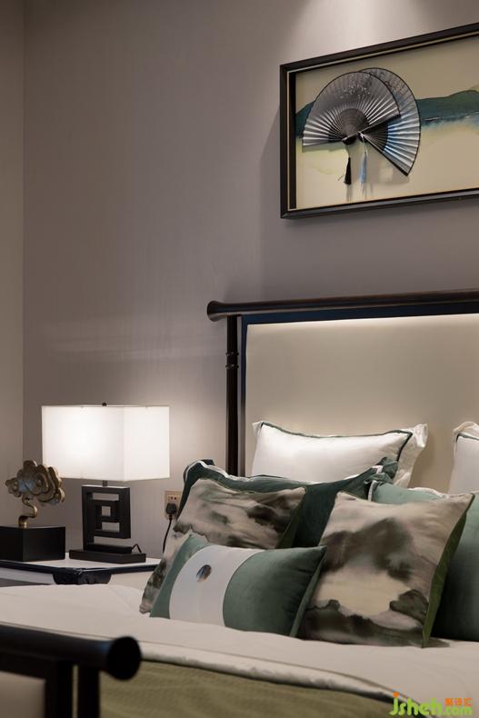 老人房整体空间散发出端庄素雅的迷人气质,以橄榄绿、海军蓝搭配灰白色调凸显东方自然朴素的格调,诉说岁月静好般的从容和优雅。