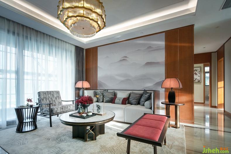 客厅背景墙由水墨淡彩山纹硬包和木饰面装饰构成,画面意境悠远,虚实之间一股中式气韵仿佛呼之欲出。