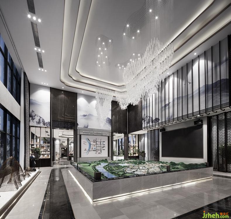 沙盘区吊灯结合仰天湖水的流动形态及昭山的蜿蜒走势,进行材质与造型的选择,强调项目的依山傍水的地理优势,同时借助层高优势塑造沙盘区的视觉亮点,优雅而不乏仪式感。