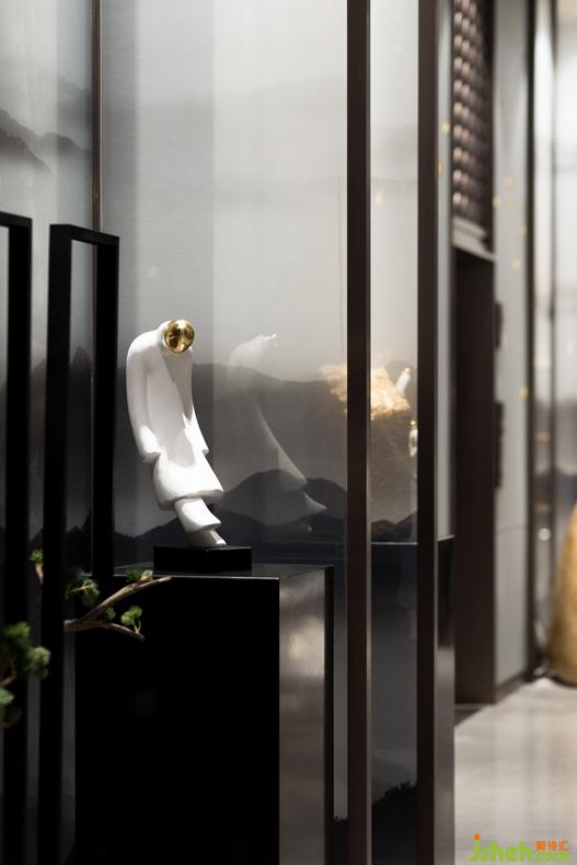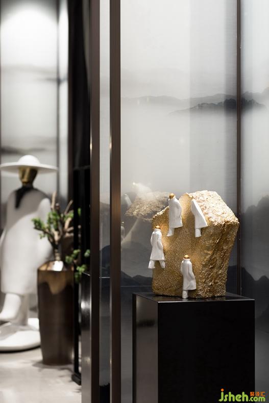 层板陈设注重疏密程度的错落摆放,通过古韵造景赋予空间文化底蕴感,同时隔而不断,打造移步换景的园林式布局。