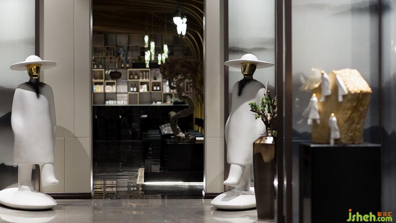 本案售楼处由两栋建筑连接而成,中间通过连廊衔接,人形雕塑是穿梭时空的使者,连接过去与未来,传递湖湘文化中“敢为天下先”的精神气概。