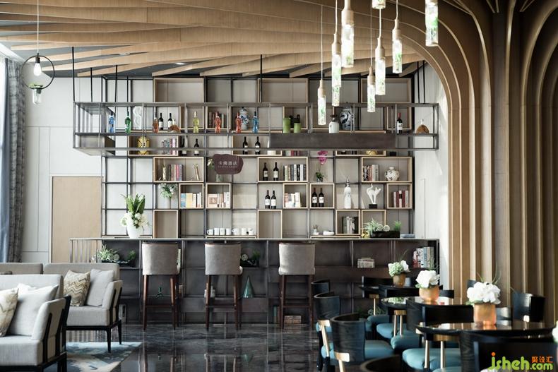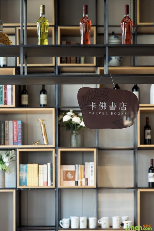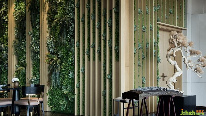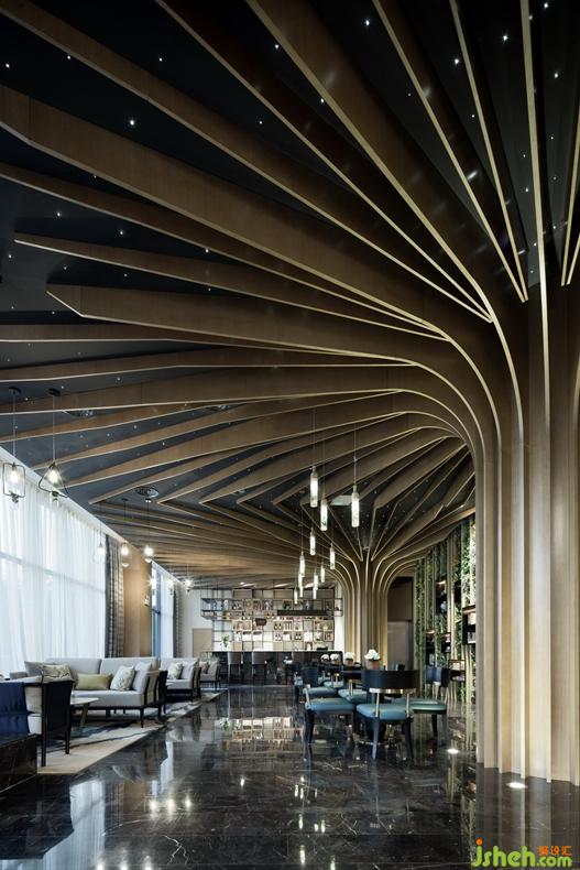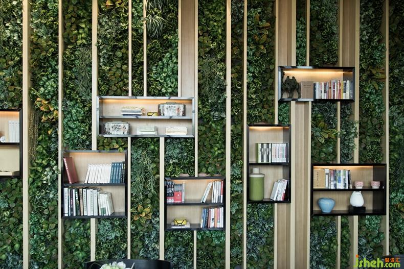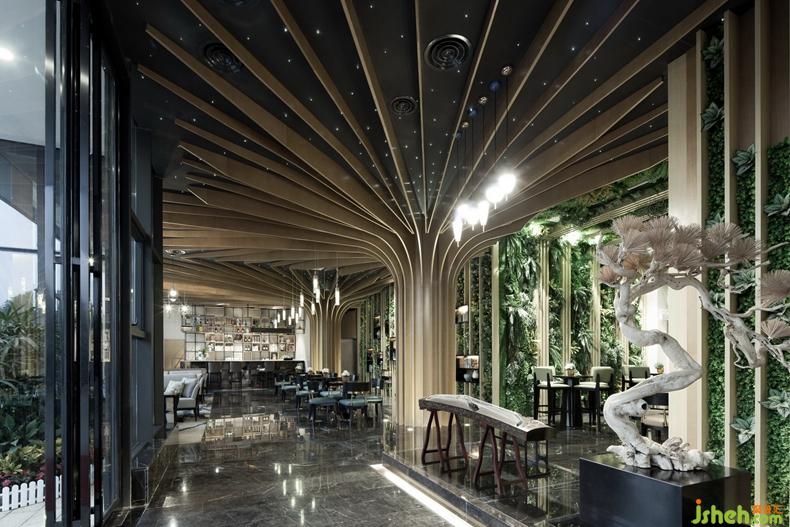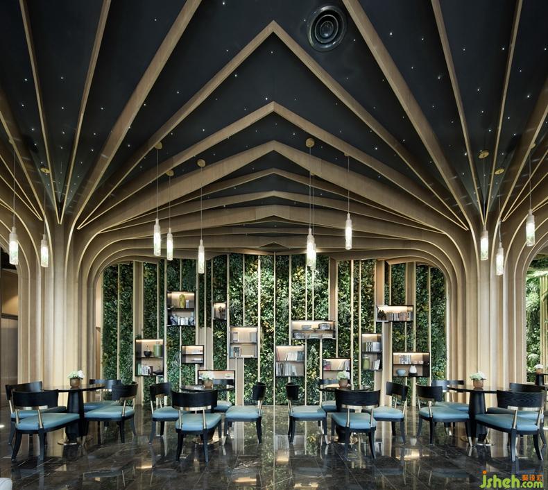 连廊另一头是承担本案休闲功能的咖啡书吧,放射形线条让两颗生态树成为整个书吧的视觉焦点,配合墙面绿植装饰,意在强调生态自然的人居环境所带来的轻松惬意。