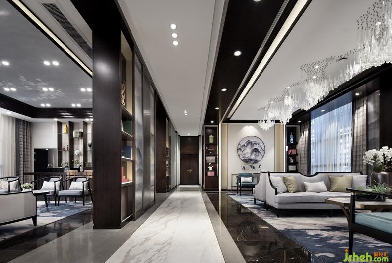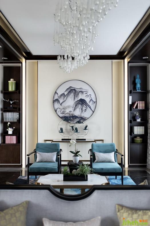 售楼部二层为两个主要洽谈区,利用舒适的沙发软垫触感及新中式靠椅精致与古韵,同时于空间中融入抽象的山川元素,打造出洽谈区的尊贵感。