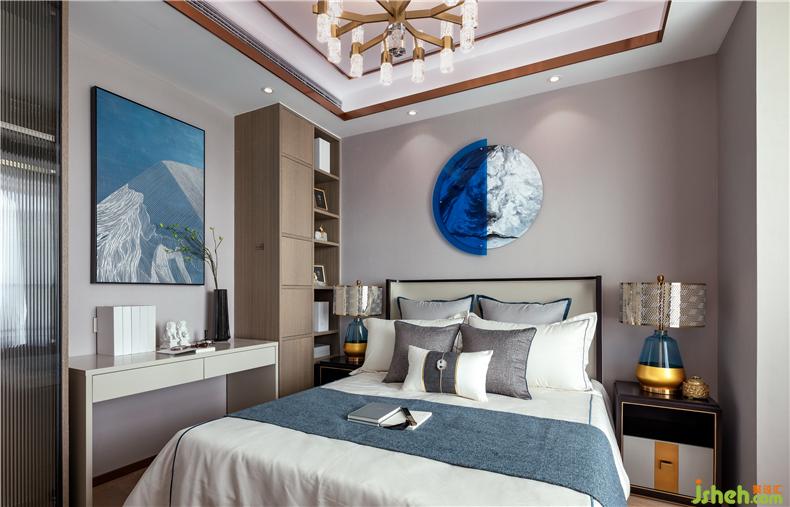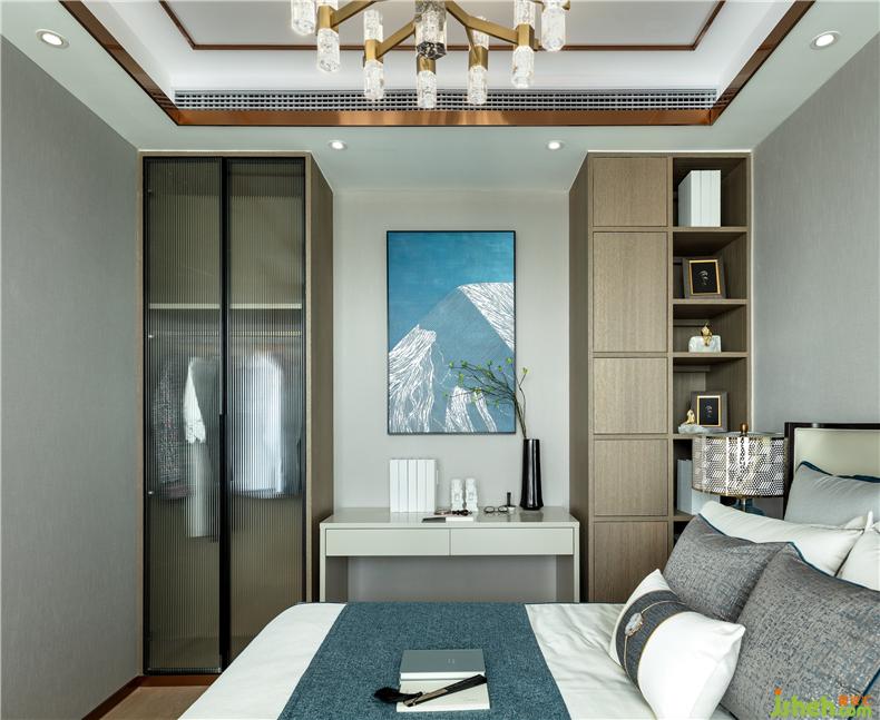 主卧空间,融入东方禅意哲美,素白层峦的山纹与蓝的布局通达无限心境,样板房设计是静待心安的视觉感染,更是久处不厌的灵魂陪伴,栖息身心。