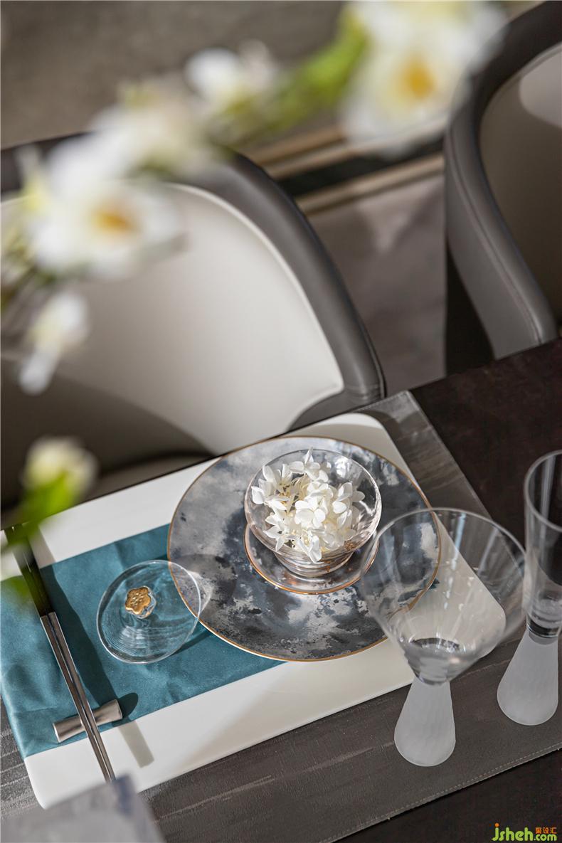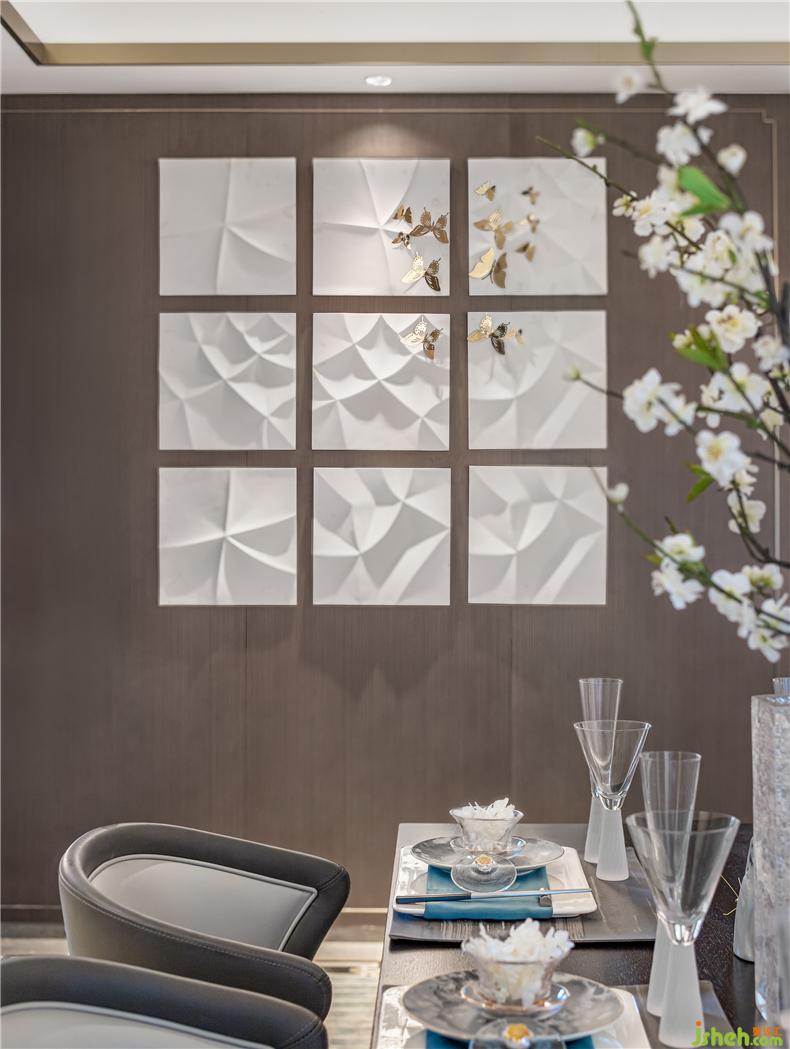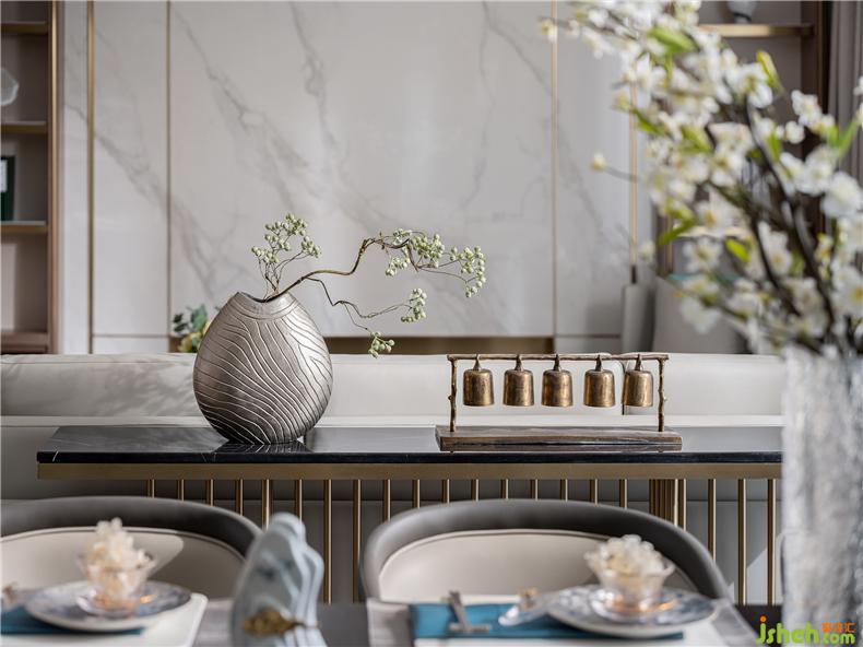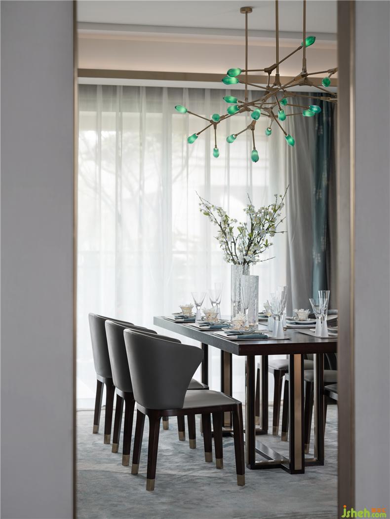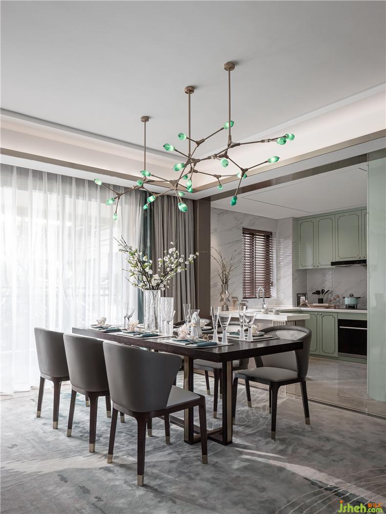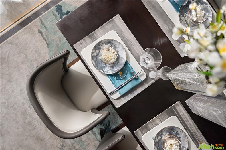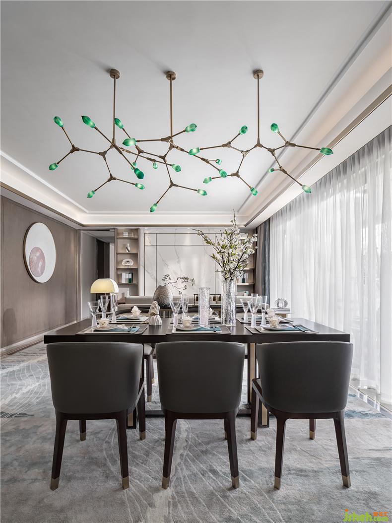 餐厅上方悬挂极具设计感吊灯,用极简的设计寓意硕果累累,为空间加注灵气,样板房设计餐桌椅与空间整体色调一致,给人沉稳尊贵的印象,杯盘交错间,加以金属构件装饰,为视觉路径创造停留点