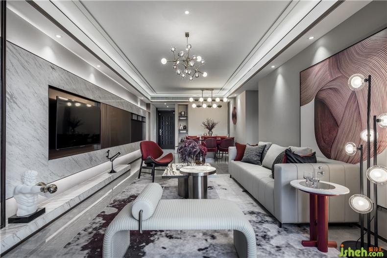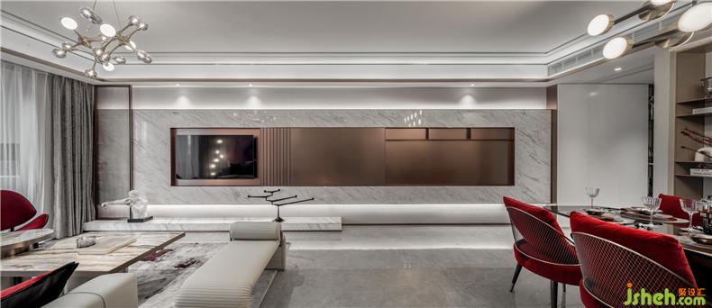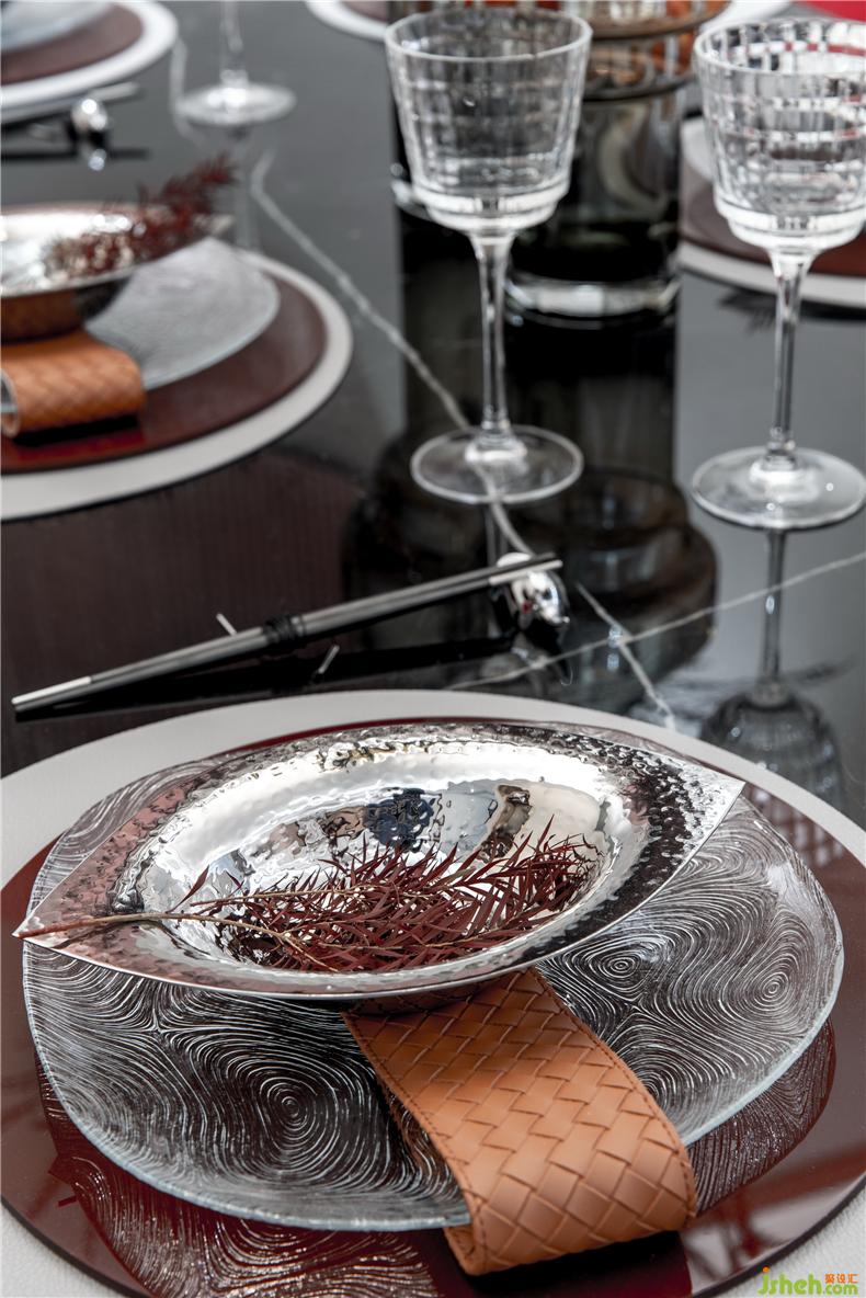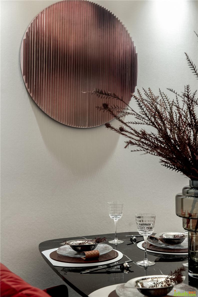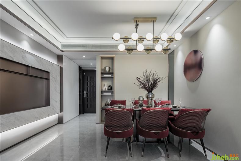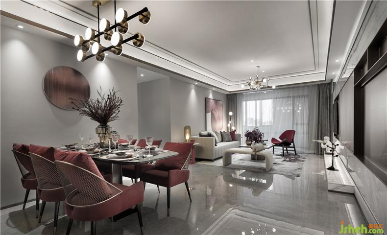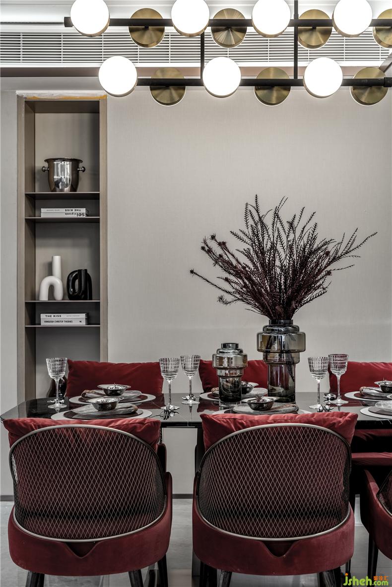 红色绸面的餐桌椅交替搭配使餐厅空间多了一些活泼和韵味。样板房设计具有浅灰花纹的透明花器配轻奢金色的艺术灯具则提升了几分奢华感,金属与琉璃组合的餐具也再一次起到了遥相呼应的小精致