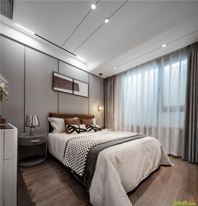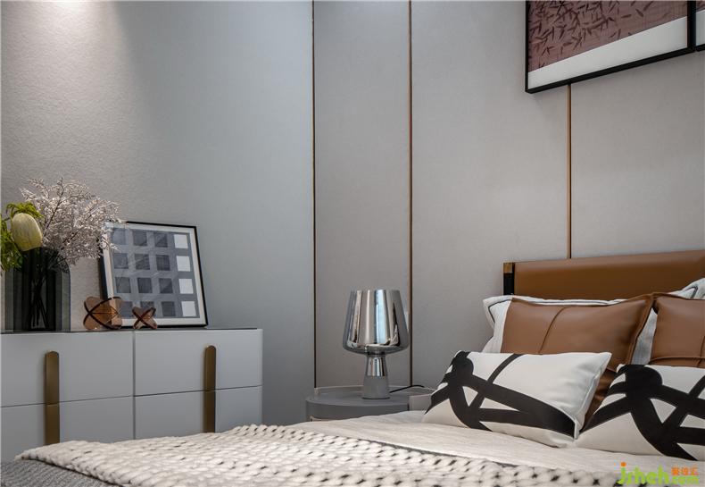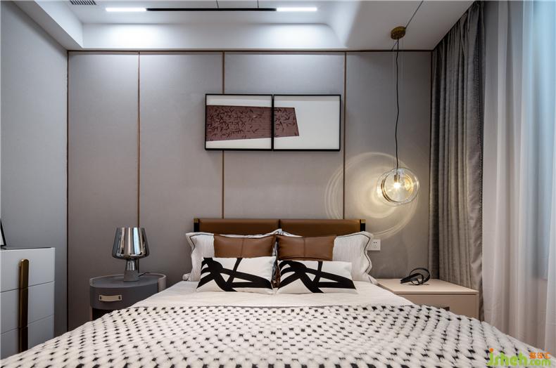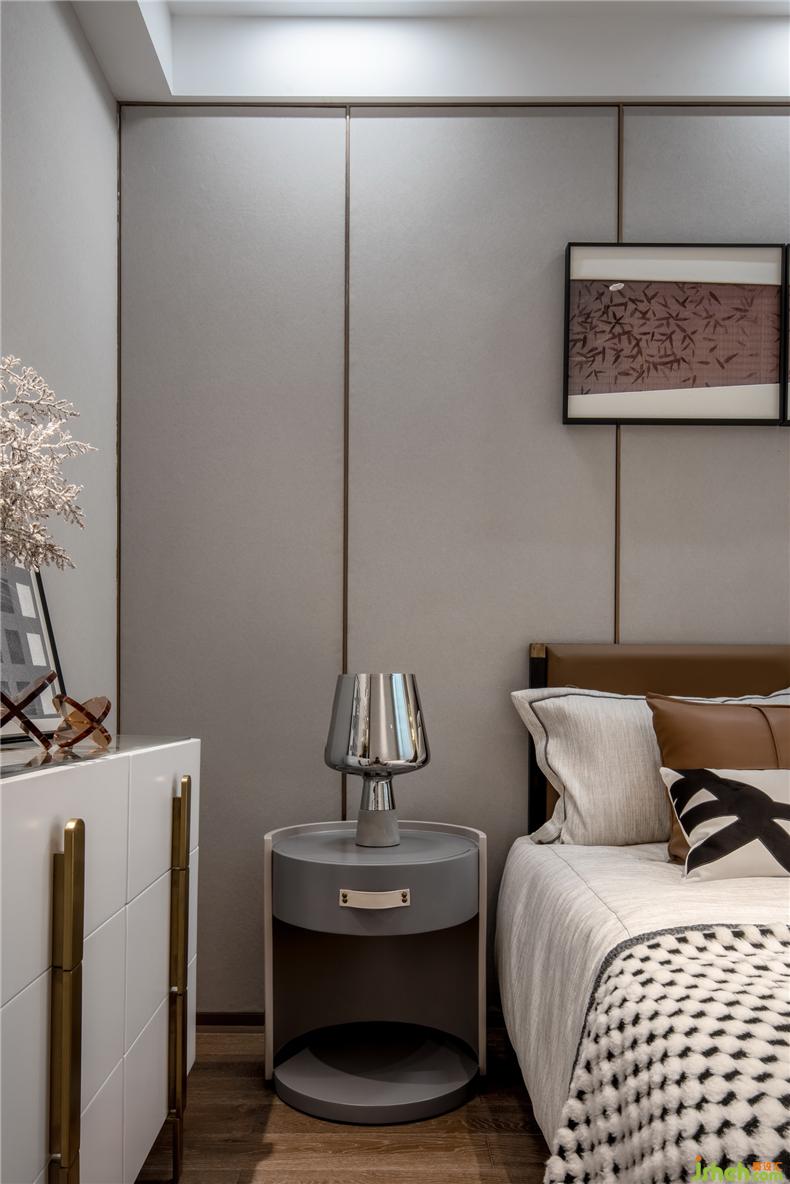 次卧空间在色彩上以宁静淡雅的咖色作为主基调,跳跃的灯光作为点缀并置其间,形成光晕与材质之间的强烈碰撞,让整个空间场域呈现出简璞自然而不失灵动与贵气的氛围。