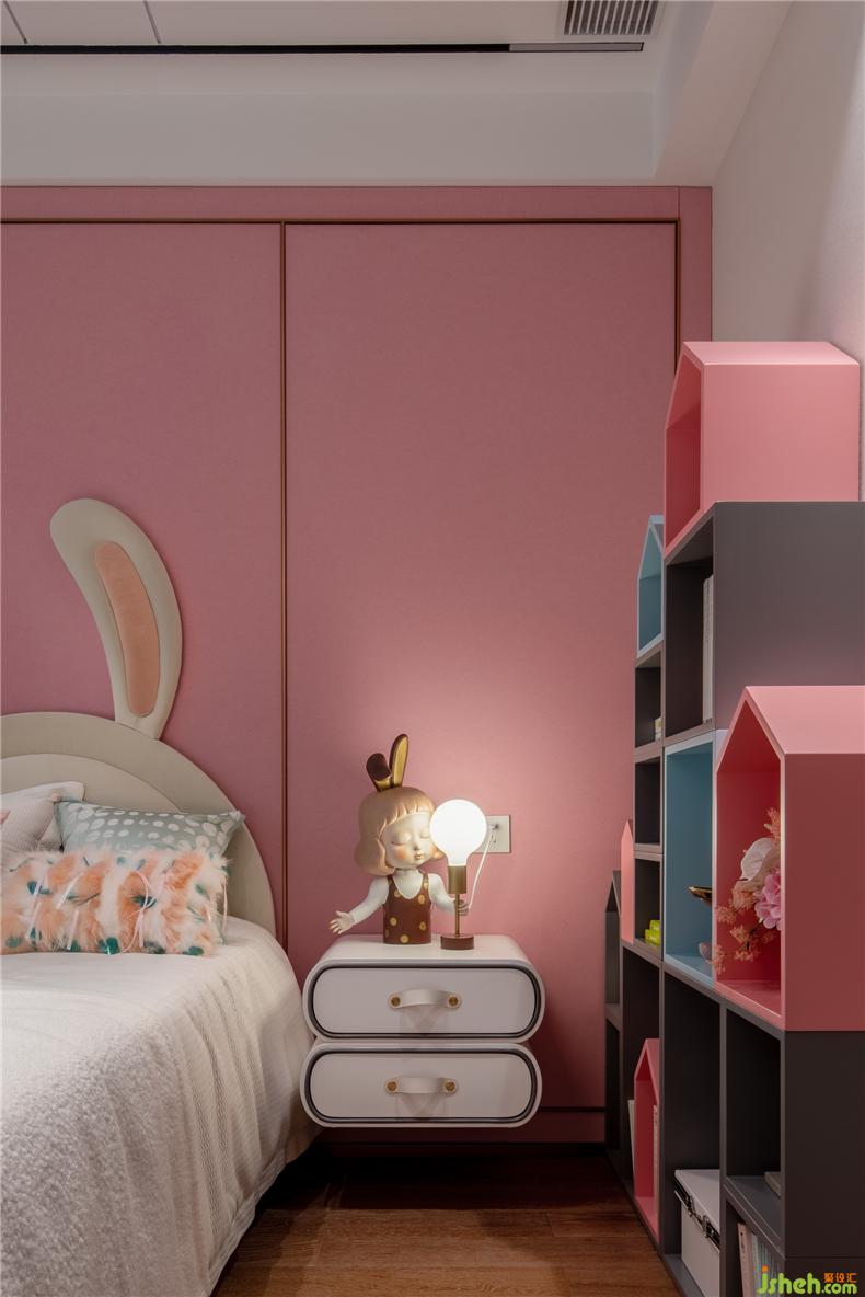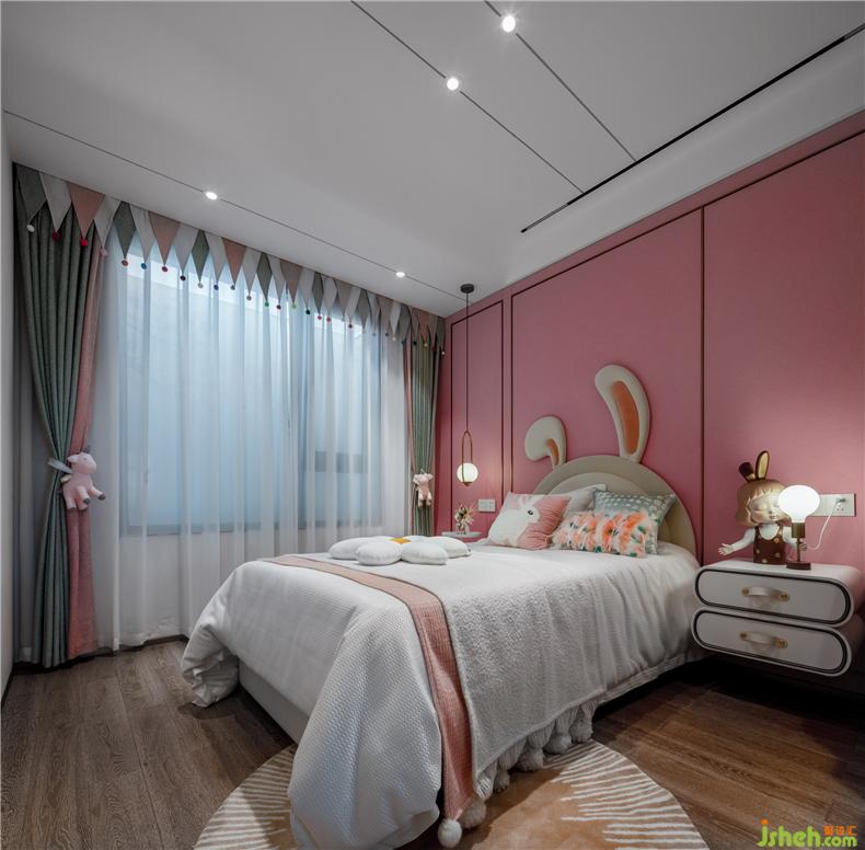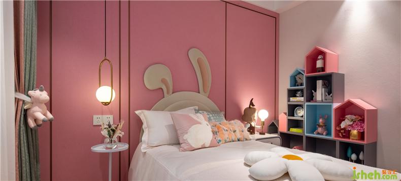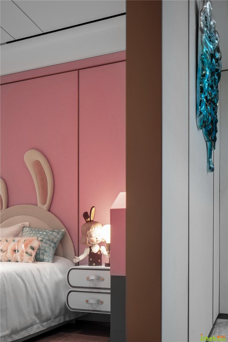 女儿房的设计以兔子为主题,充满少女心的马卡龙色调,精致可爱的兔子元素,样板房软装设计结合灯光,构筑孩子心目中梦幻、意趣而又温馨的童话世界。