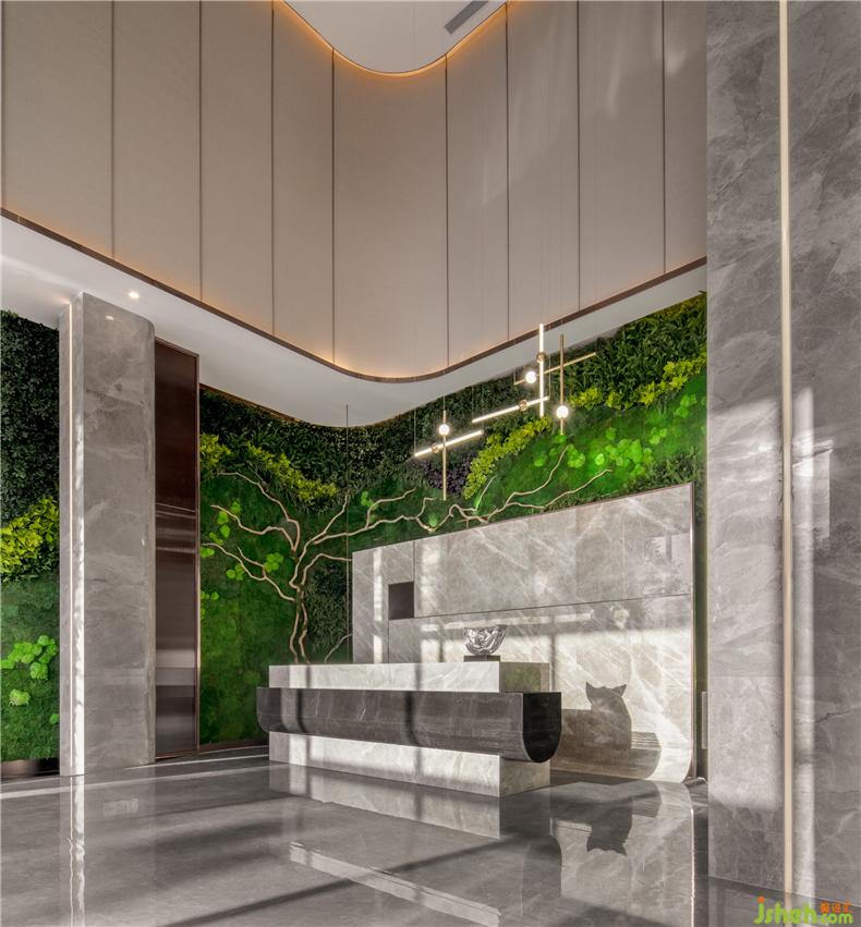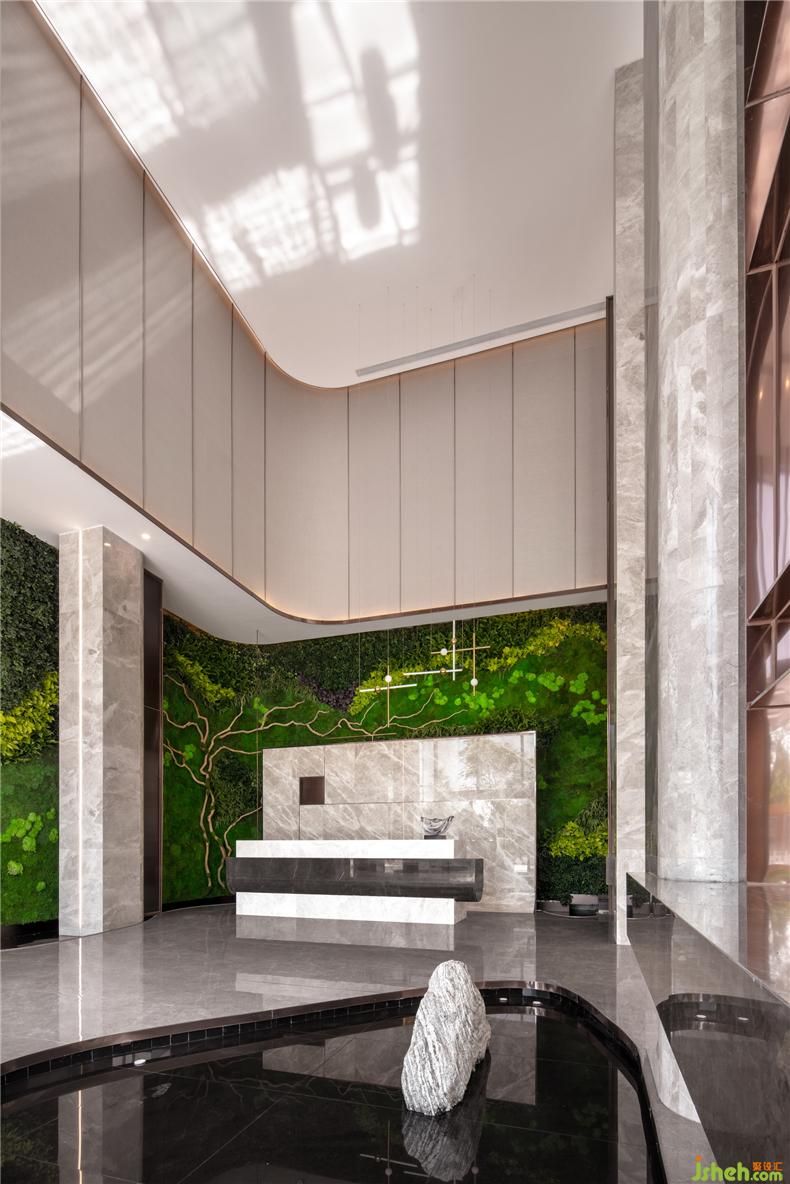 室内水景延伸室外园林,提升建筑内部的亮度与宽敞感,沐浴在充沛的自然光线之中;植物墙设有自动灌溉系统,灌溉后的水通过下方水渠排出,使空间与森林融合为一体,能够有效地增加起居舒适感,使人身心为之一畅