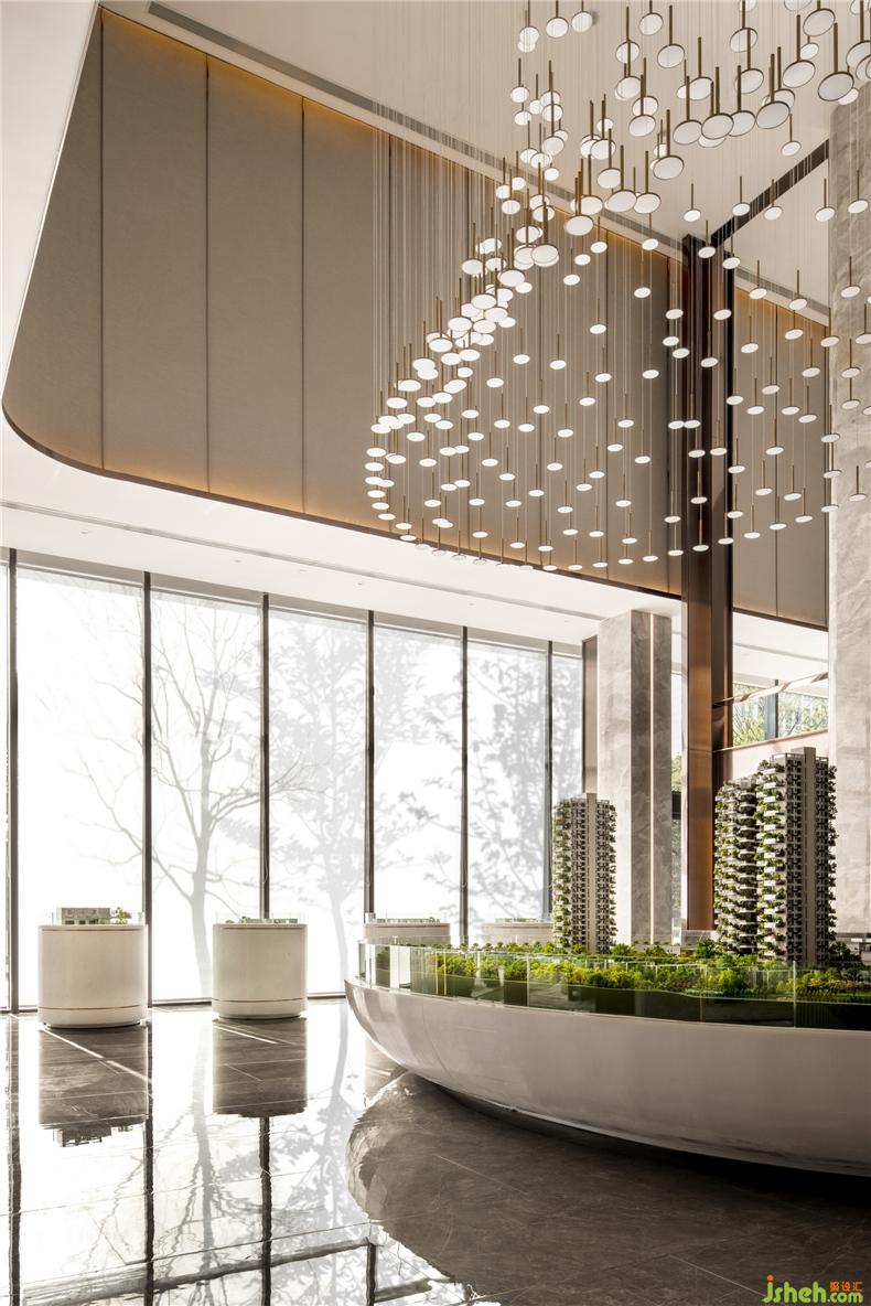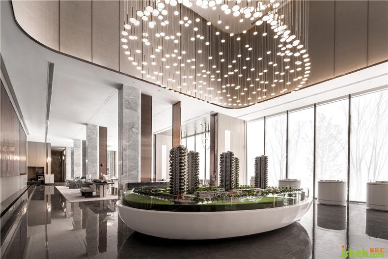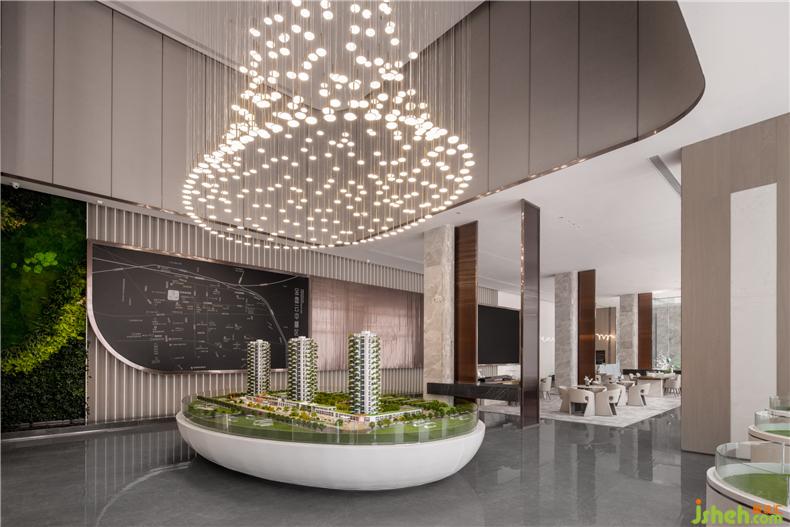 沙盘上方的艺术装置,如扬起光辉的太阳,体现出典雅大方与现代艺术的和谐交融,诉说着整体空间的沉淀与轻盈,从大小渐变再到纵向排序,犹如皎若旭日,轩然霞举,呈现标杆之作。展现与城共筑美好,致敬领潮之城