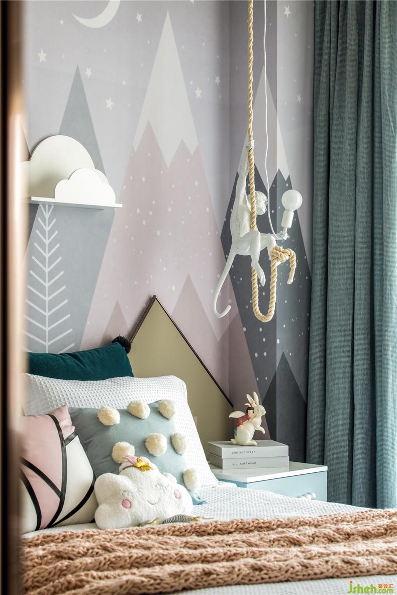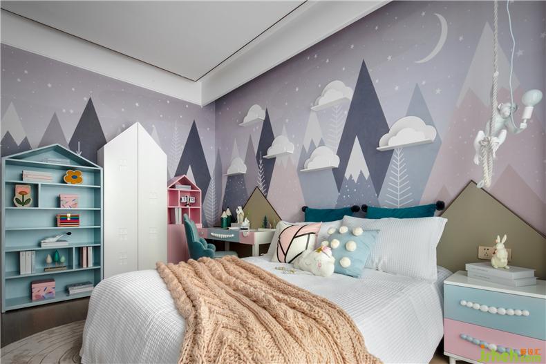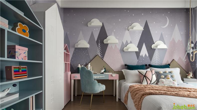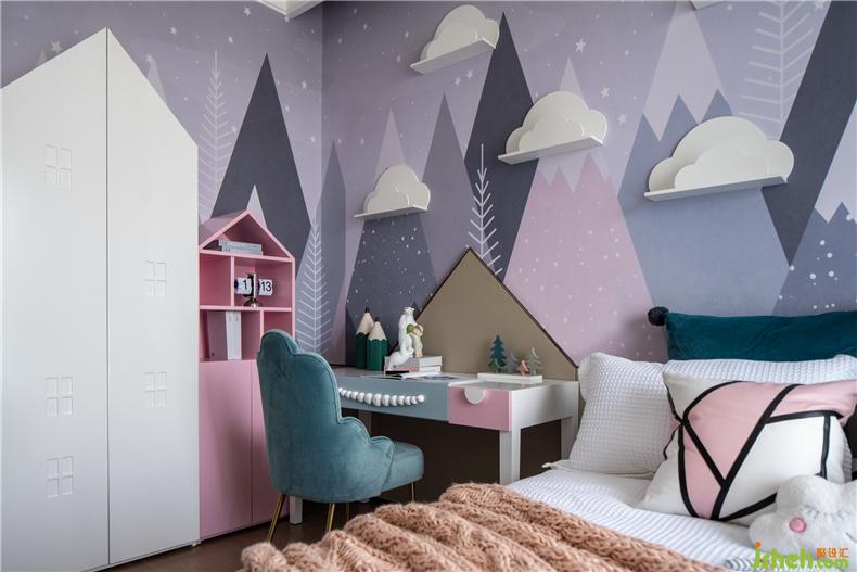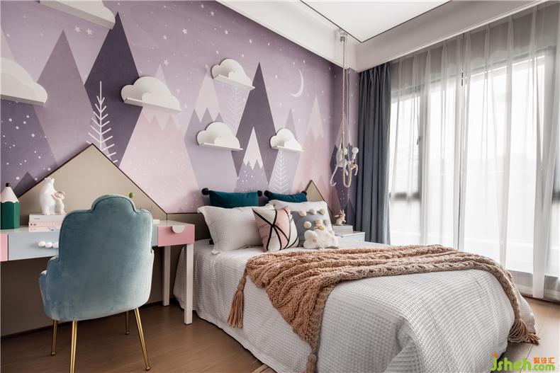 女儿房背景为柔和的紫色图案墙纸,软装在家居造型上以现代为主,造型简练,样板间设计也不乏一些让人欣喜的创意巧思。棉麻布艺本就有一种质朴的优雅,而浅橙色和紫粉色又让空间更多了一份清新活力。