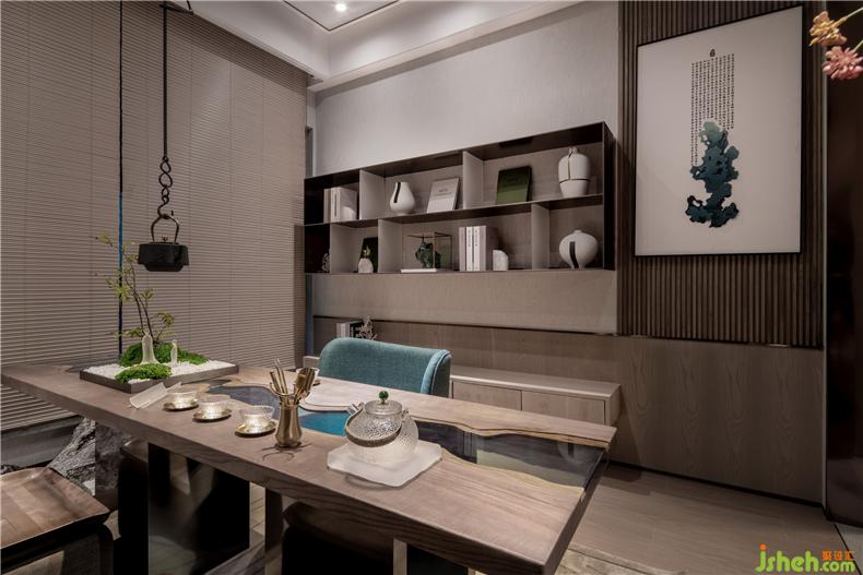 茶室兼顾阅读室,借助玄关格栅透过来的光线自然,婉约闲逸,诉一段心语幽思,流淌于清浅时光,一抹写意,几许禅意,琴棋书画,诗酒茶花,每一闲情雅致都能在这一方天地里怡然自得。此境此景,当言“明窗净几,笔砚纸墨皆极精良,亦自是人生一乐。”