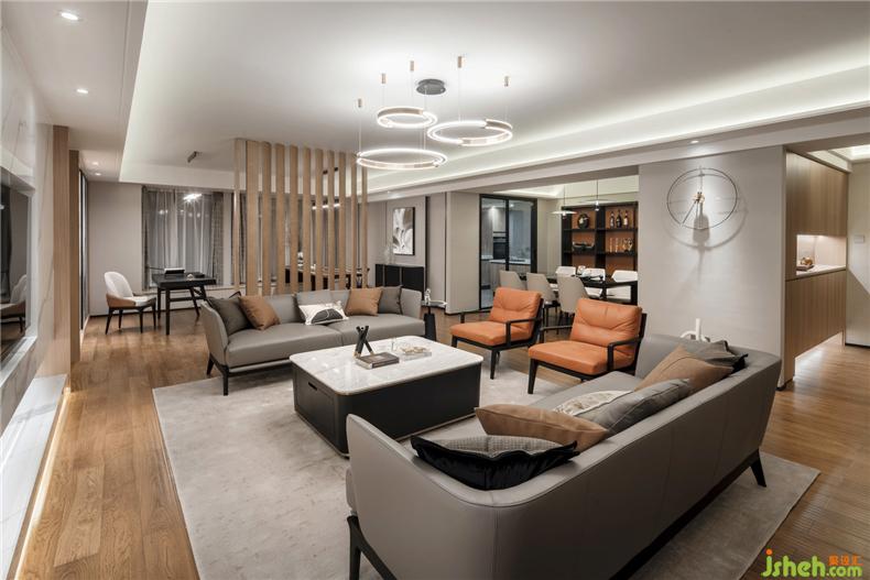 在多人沙发后间隔五十公分处,打造木格栅屏风背景墙(木格栅由师傅手工安装)。木格栅屏风保留活动性,可随主人喜好,调整转动,私密与通透随意切换。