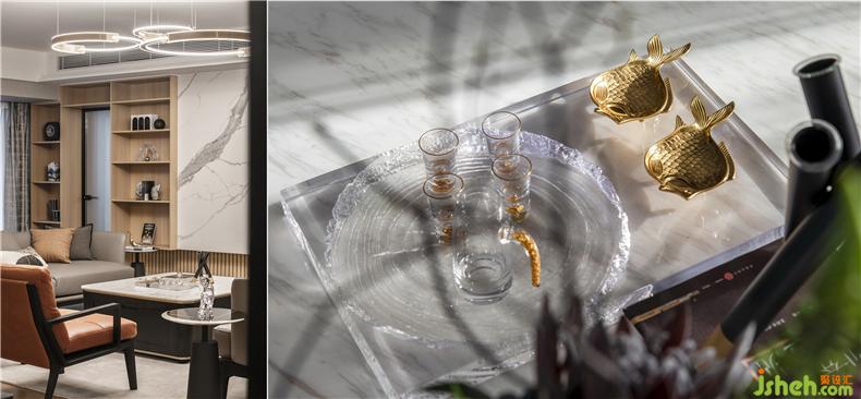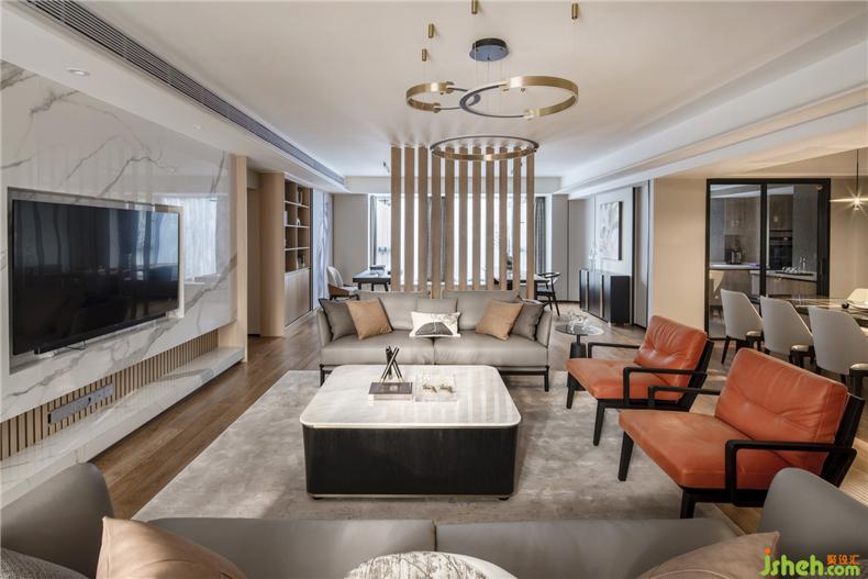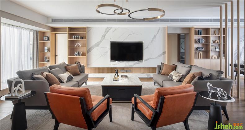 客厅空间开阔,布局明朗,电视背景墙部分整体墙面设计,集储物与装饰功能一体,鱼肚白大理石、木色的展示柜、长虹艺术玻璃门隐形门镶嵌其中,材质与色彩碰撞,迸发生机,赏心悦目。