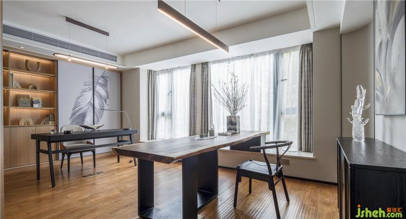 原户型书房位置是一个单独的房间,如今打掉隔墙,设计成开放式书房兼休闲茶台区域,满足业主多样性的功能需要。