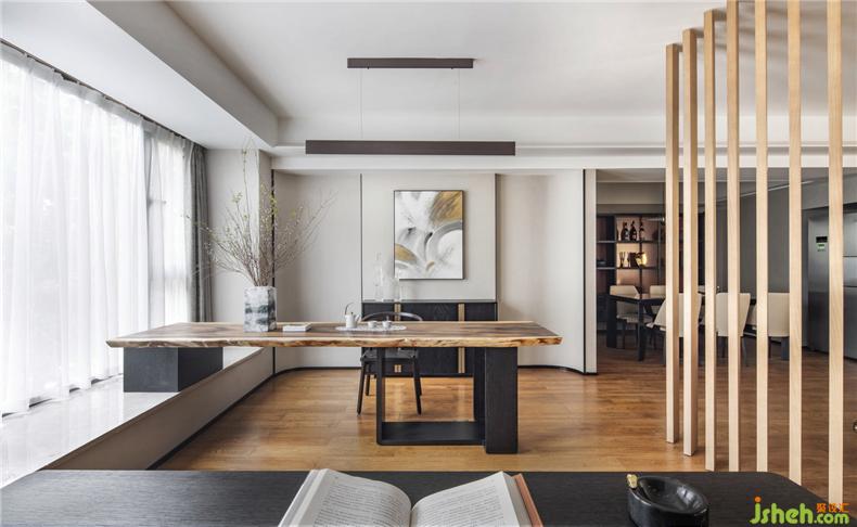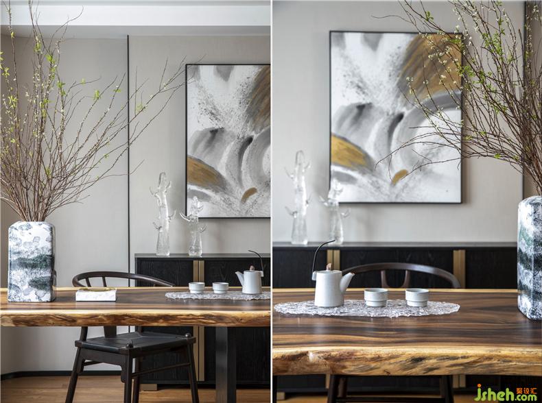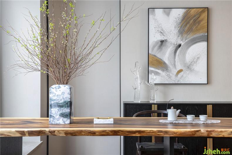 由于业主对热爱茶道,设计师特意定制了独特的茶台,2.8长米的实木桌与凸窗结合,台面开阔,再放置业主喜爱的鲜花,整个设计极富禅意,是友人至家中饮茶闲谈,尽享安谧时光的极佳之处。
