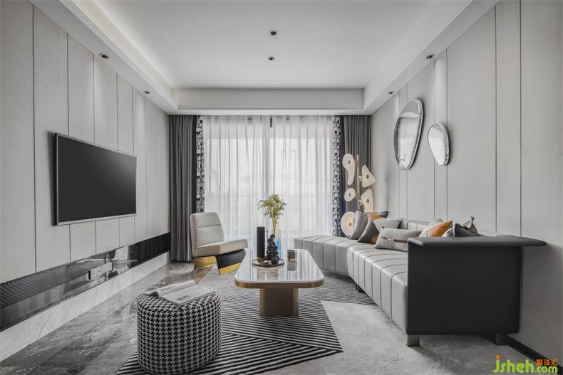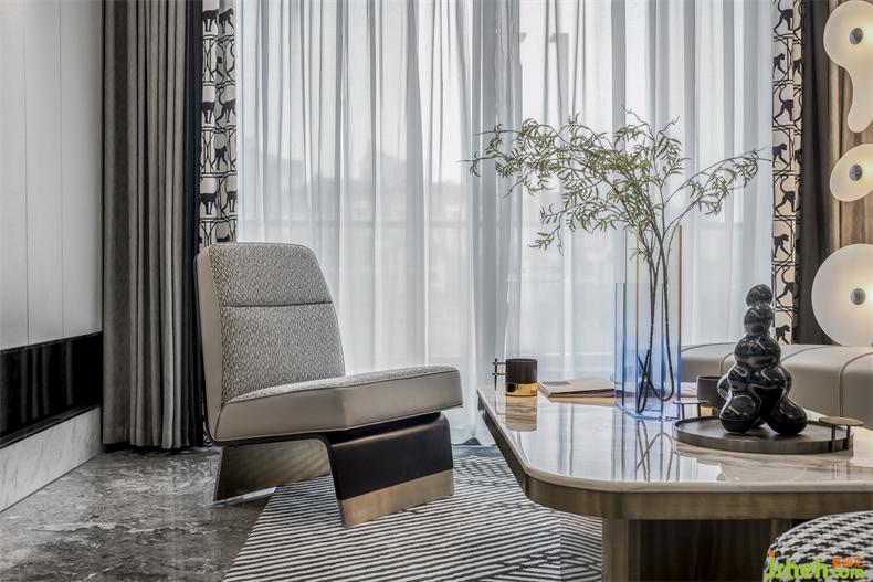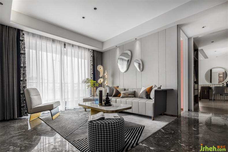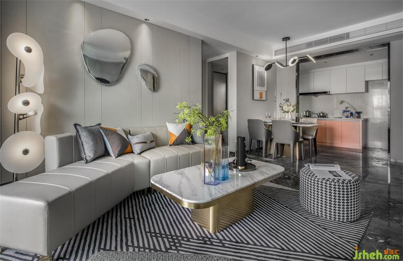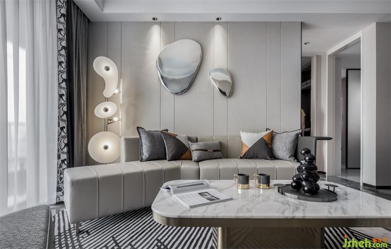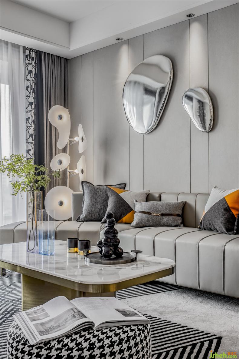 别具新意的不规则沙发设计,立体跳跃的圆形金属装饰挂件,样板房设计皮革、金属等元素和谐交织,在定义空间的同时,以摩登的立体化设计编制出空间丰富的表情