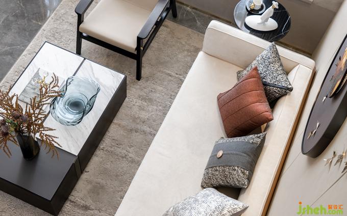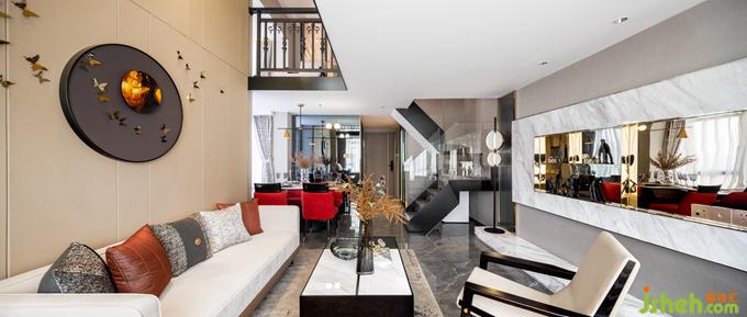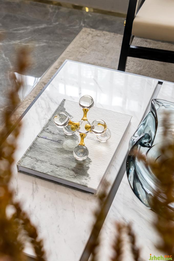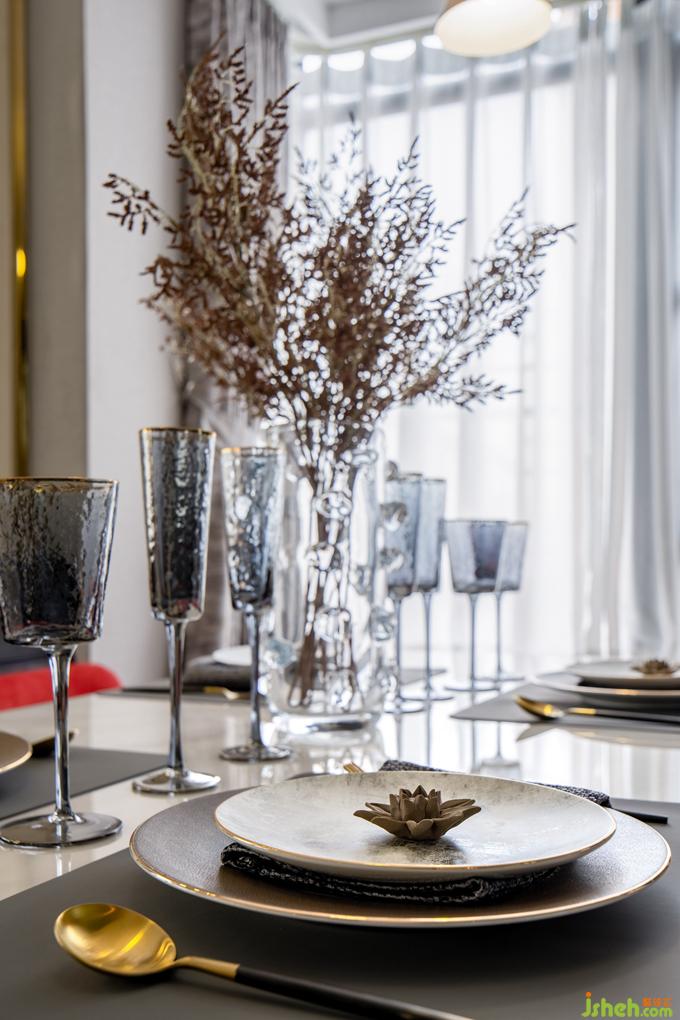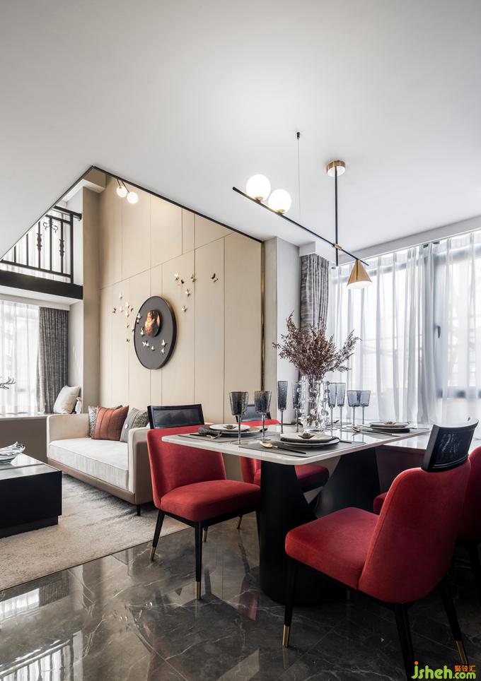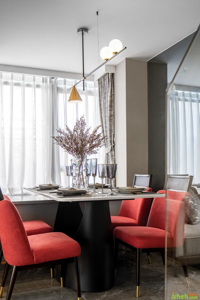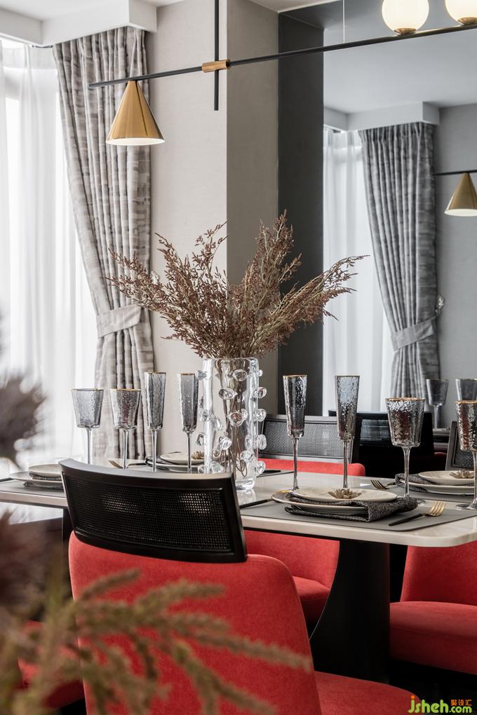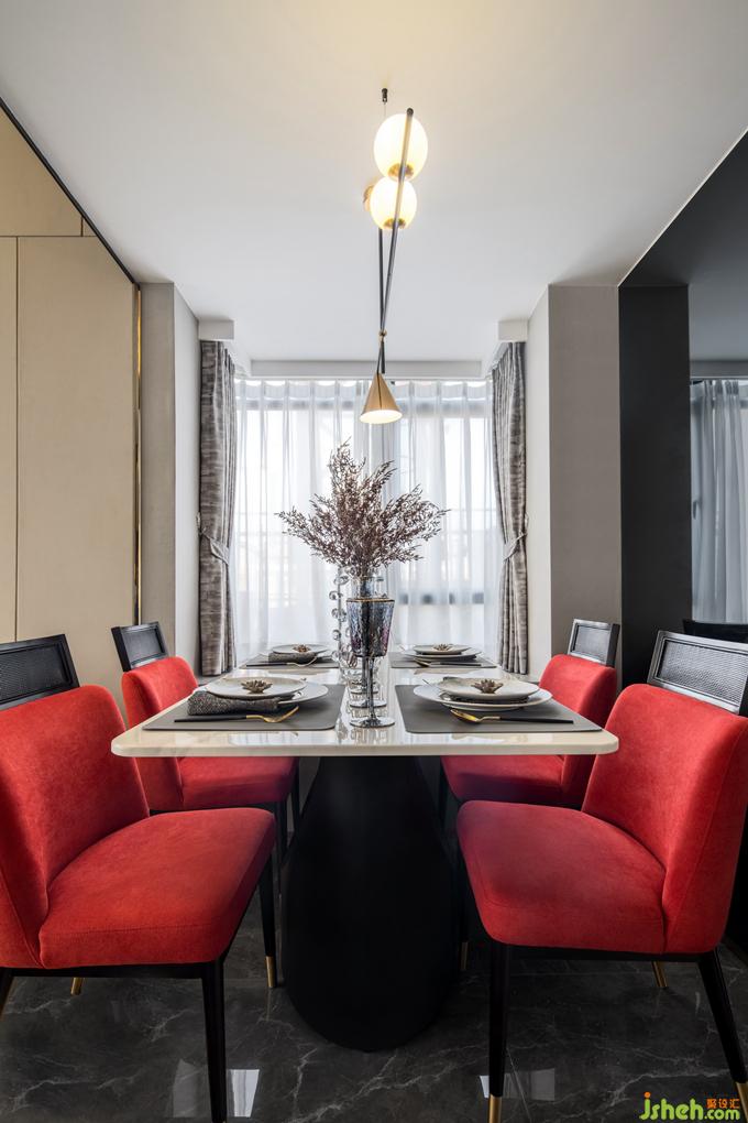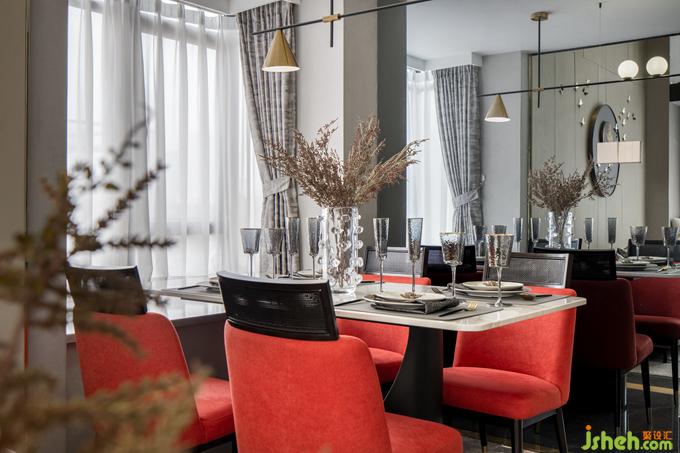 餐厅靠近一侧飘窗,本来略显狭小的空间经由后方的镜面反射,视野扩大,并未显得局促。公寓样板房设计浓烈的红鲜亮夺目,而浅色大理石餐桌、精致吊灯、餐具的加入缓和了强烈的个性,为空间注入温润的气息,二者相得益彰,诠释精致生活
