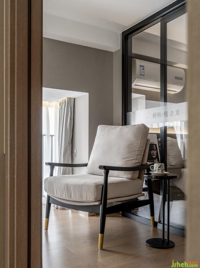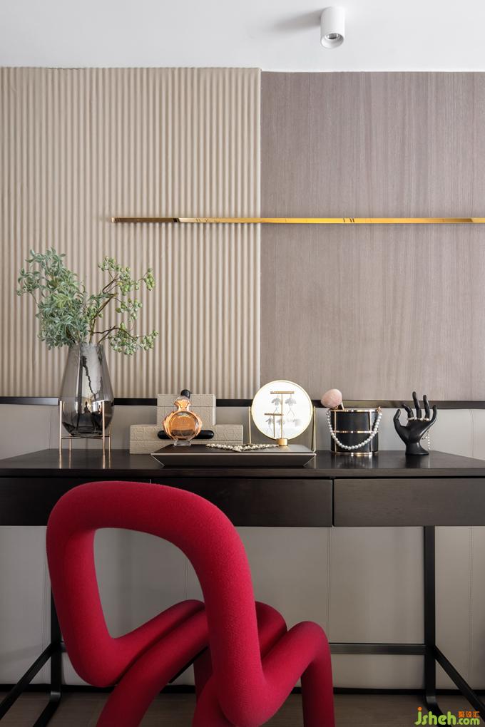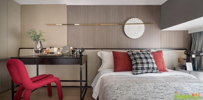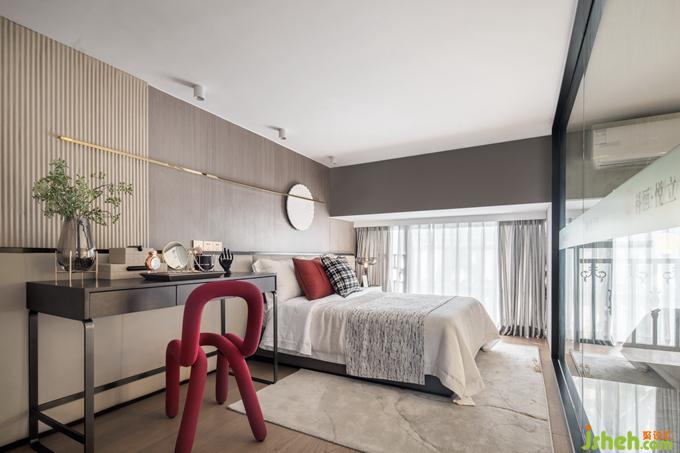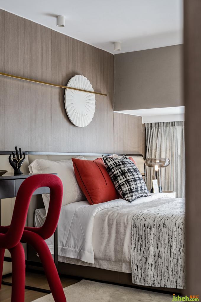 客卧以红色为主题,将大色块与不同纹理的图案调和得相得益彰,舒适简洁。公寓样板房设计师把金属光泽蔓延到了这里,与客厅风格遥相呼应。