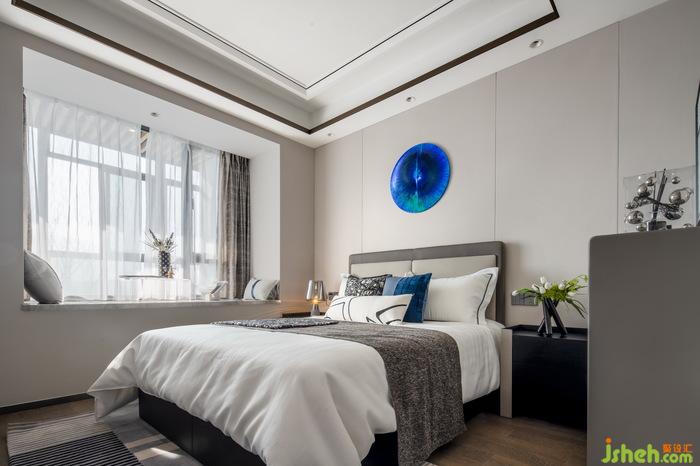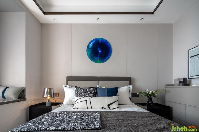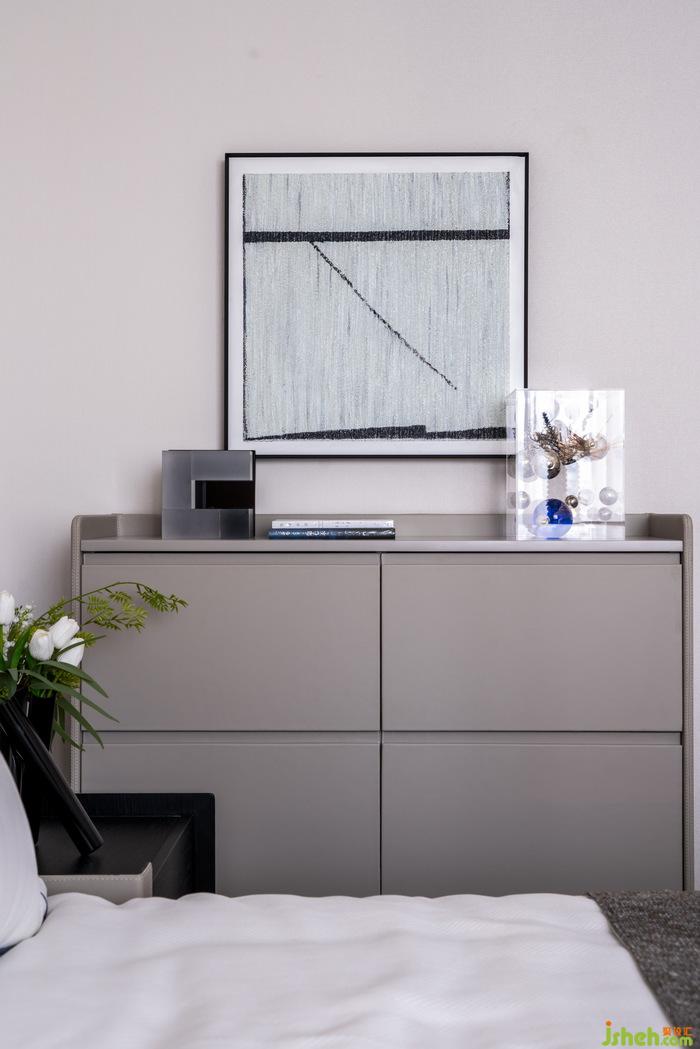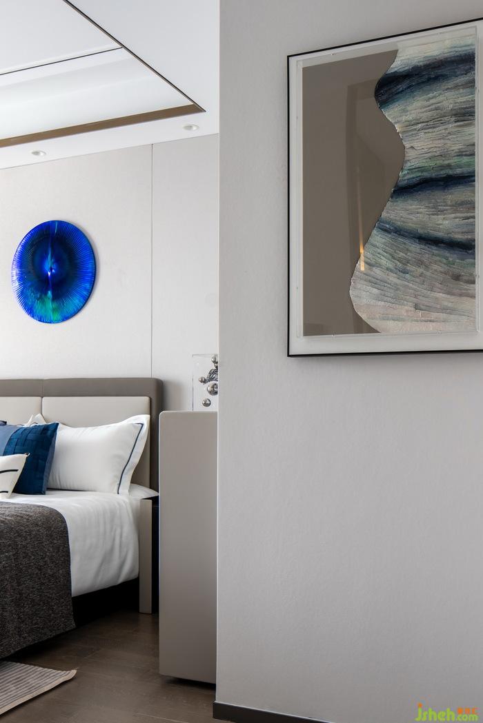 主卧空间重在细节的工艺处理,样板房软装设计去除多余装饰堆砌,个性简约的床头艺术装置搭配简约的家具,丰盈了空间的内在气场。