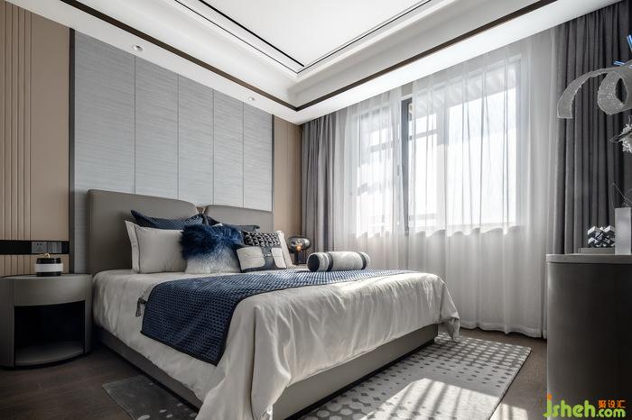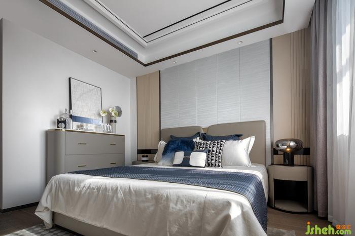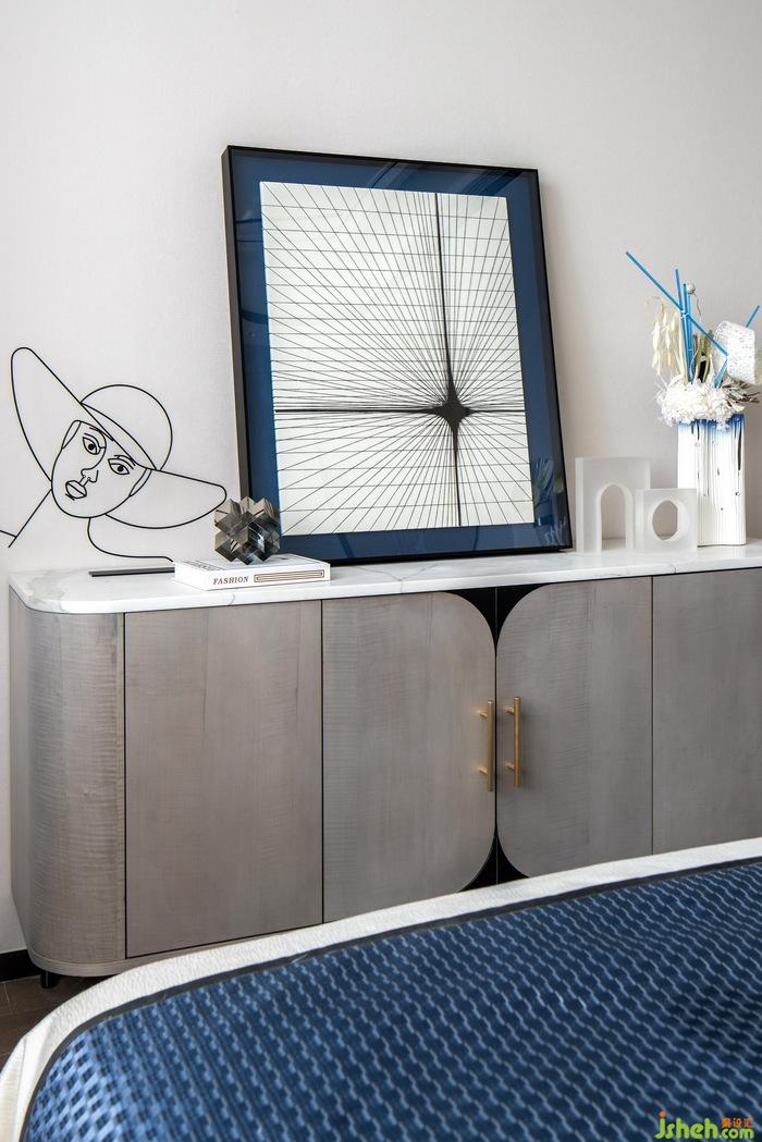 次卧空间静谧优雅,纯白床单点缀上布鲁斯蓝的家私,凸显空间时尚气质,个性独特的装饰画、摆件提升空间的艺术氛围感,低调又富有品味。