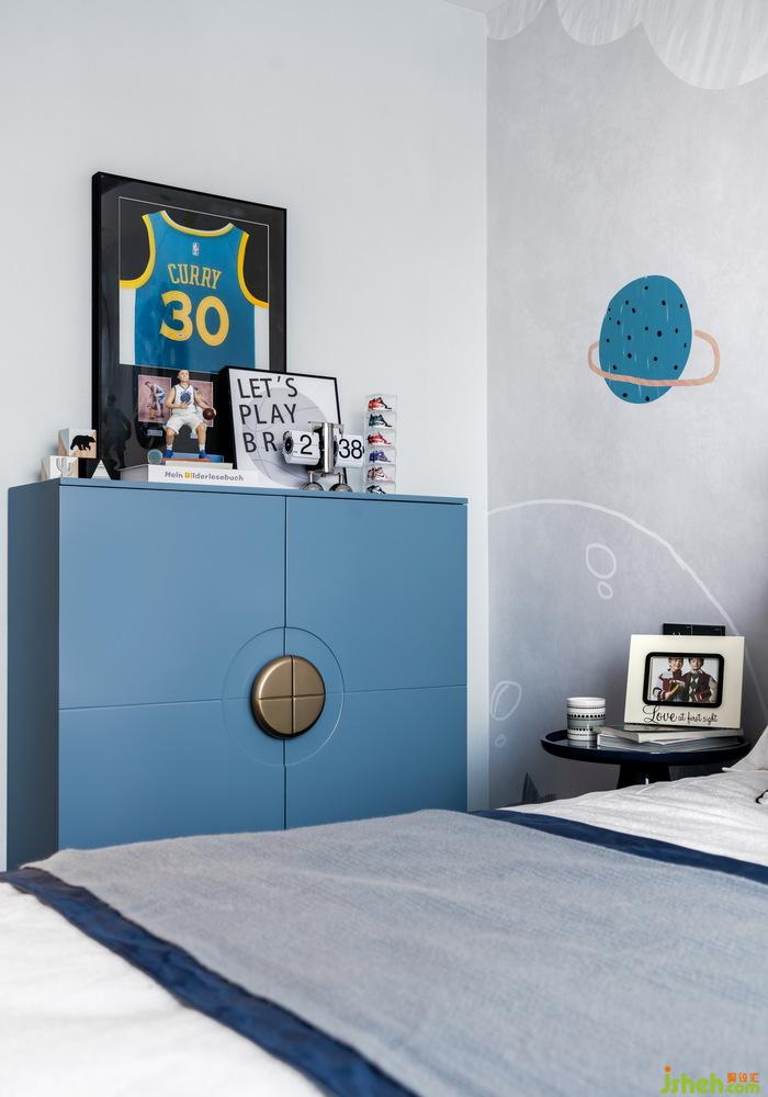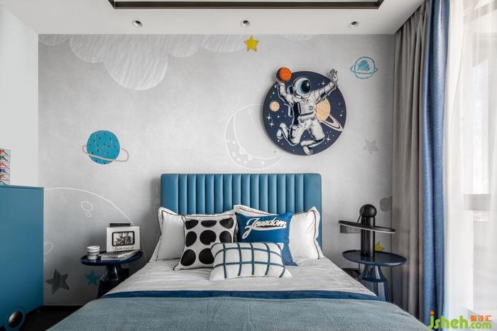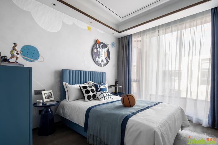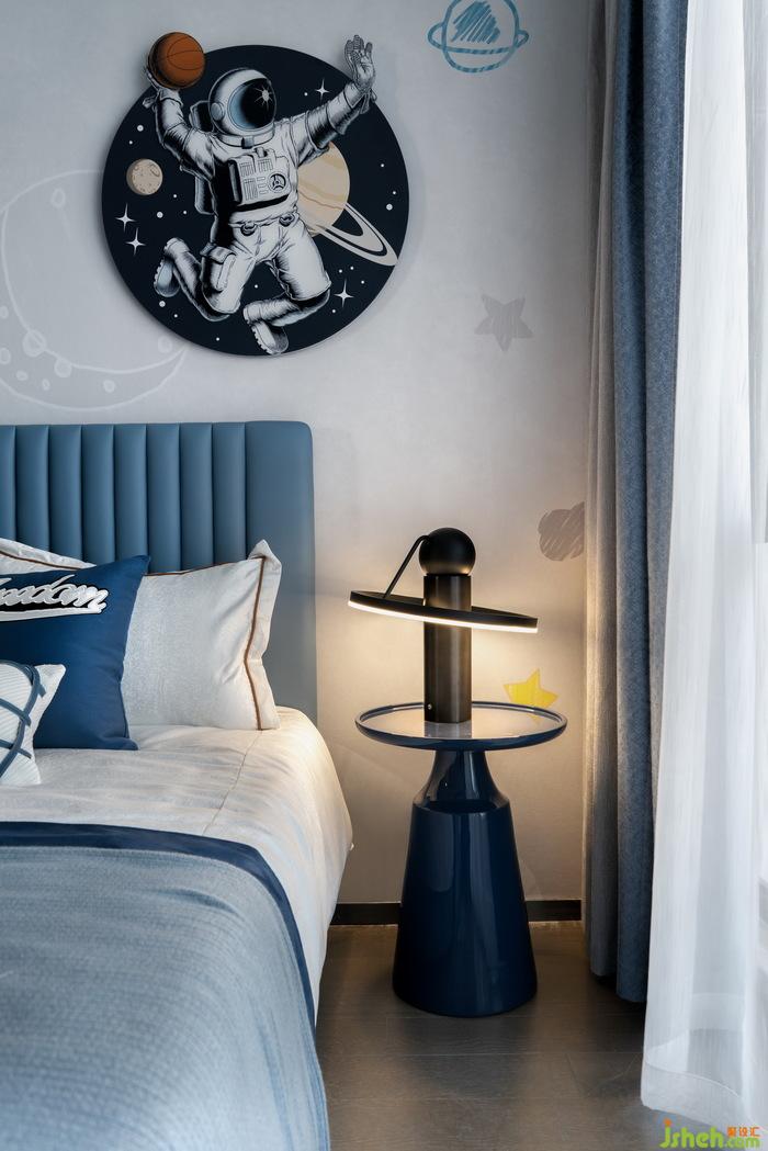 男孩房以篮球为主题,样板房软装设计整体蓝色系的配色充满活力,床头背景墙装饰结合篮球与太空元素,打造多元化的个性空间。