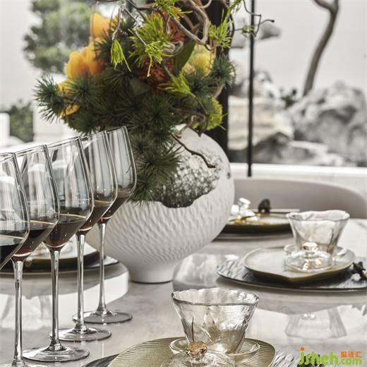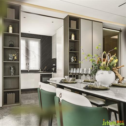 当阳光透过纱帘均匀柔和地铺在餐厅里,家人围坐于餐桌前,别墅软装设计花艺点缀三餐四季的温馨气息,天然石材的纹理与高级灰的结合,跳脱出盎然生机的翠色,沉稳内敛的皮质餐椅,衬得整个空间的精致感油然而生。