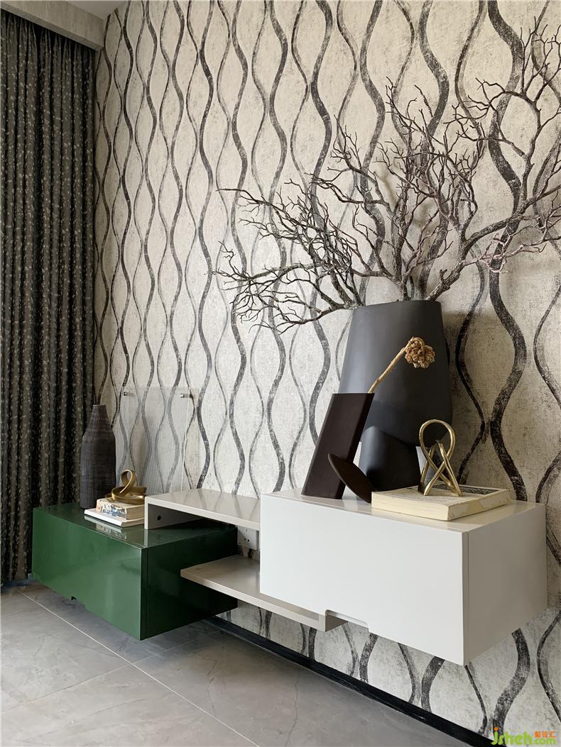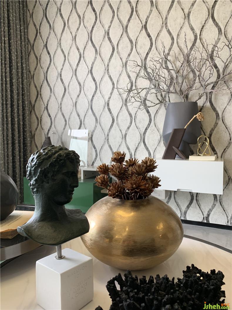大面积的大地色调壁纸营造自然气息,灰色花器和金属摆件的碰撞,