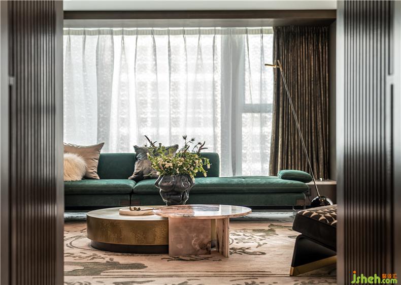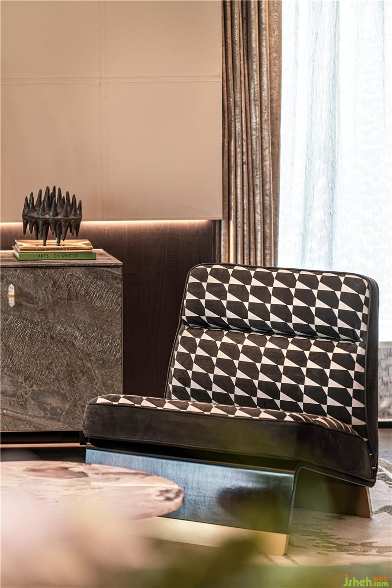 靠近电视墙的客厅角落,设置了一个Baxter的私人空间,主人回到家,光着脚踩在羊毛地毯上,样板房设计可以舒服地坐在灰色格子纹沙发上,一杯咖啡一本书,书香人生。“很少人会用真的毛皮做地毯,纯粹柔软的触感能给人以温情的治愈力。