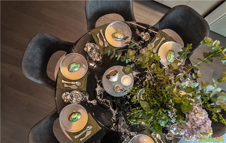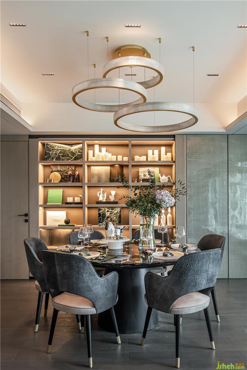 餐厅放置的大理石餐桌来自意大利高定,与艺术装置背景墙相得益彰,餐椅选自意大利奢华家具新星HENGE,以当代设计手法,带来略带复古时尚的奢华感,彰显大家气派.