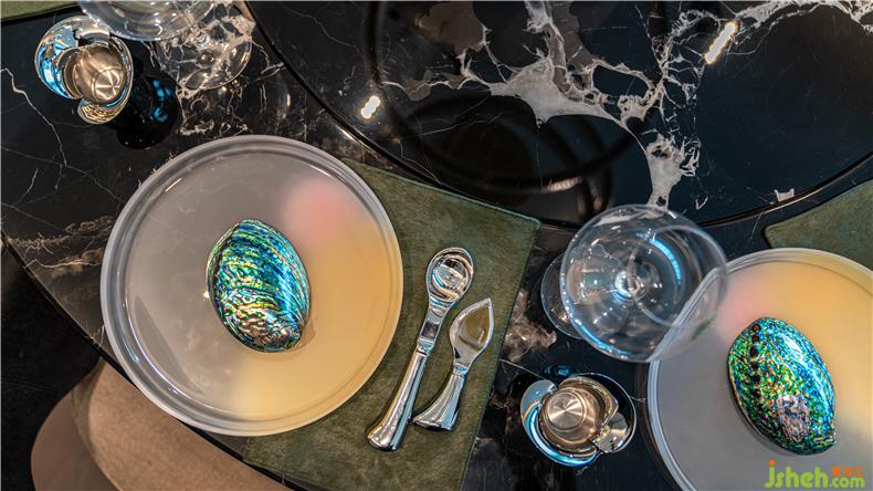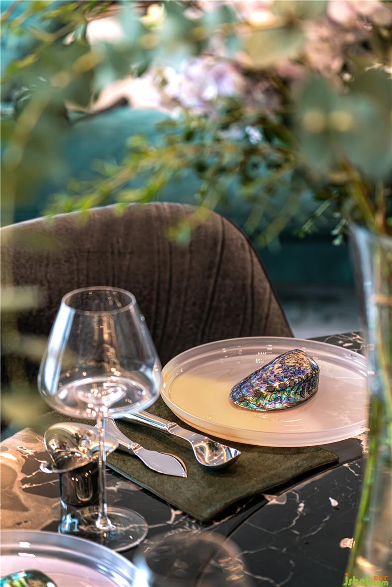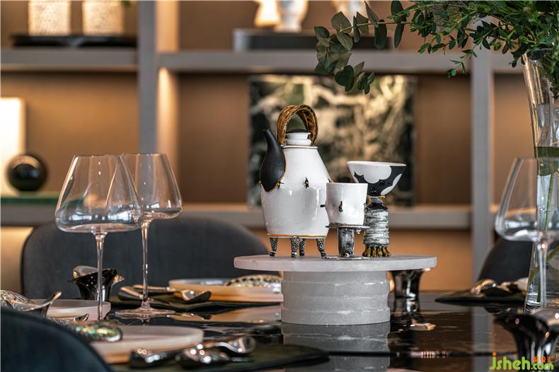 餐台上放置的Studio Formafantasma手工制作餐盘,经由乳白色材料吹制出彩色无定形色彩的颜料,质地轻透如雾,每件都有独特的肌理。桌子上的瓷壶和酒壶也是艺术家制作的。它们是独一无二的手工制品,充满了创造力和对生活的兴趣。