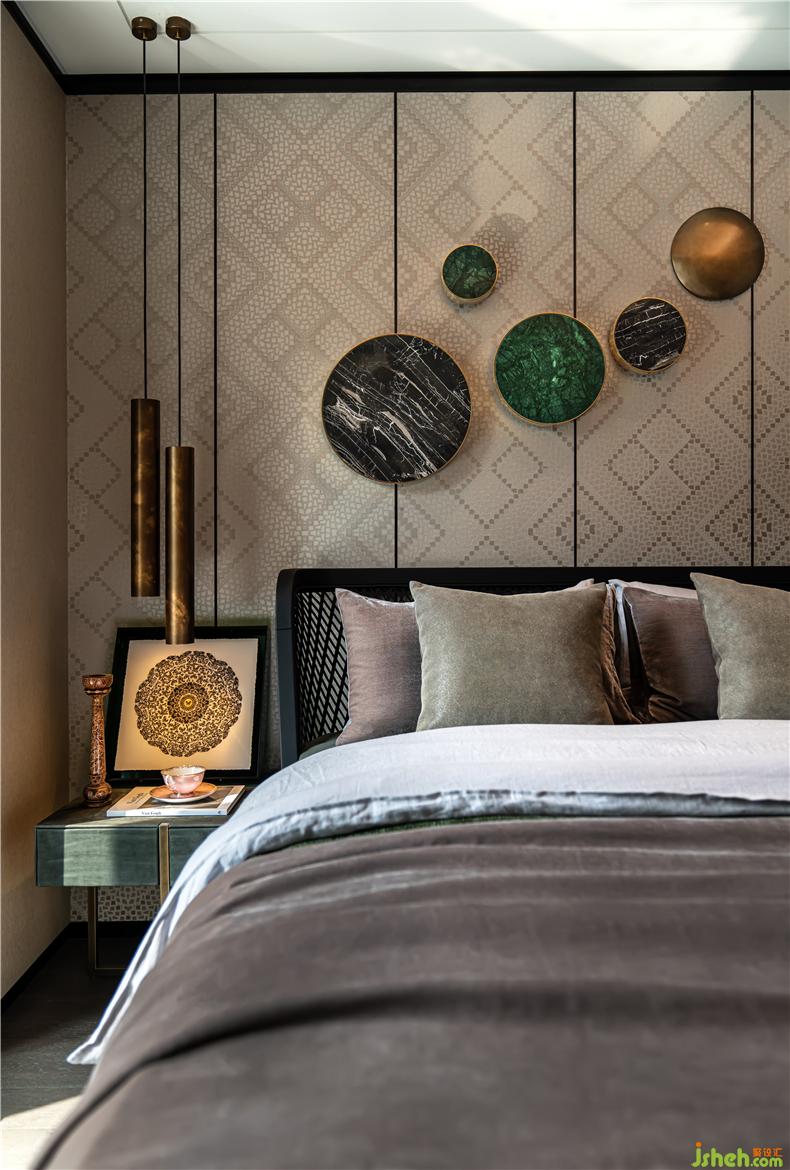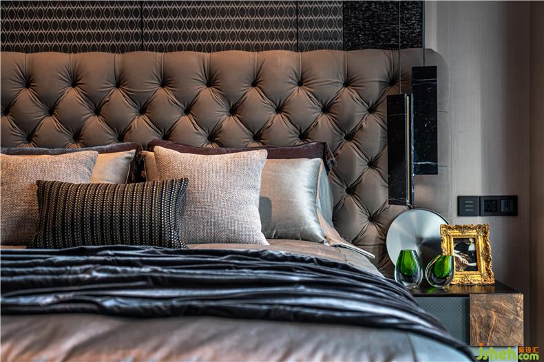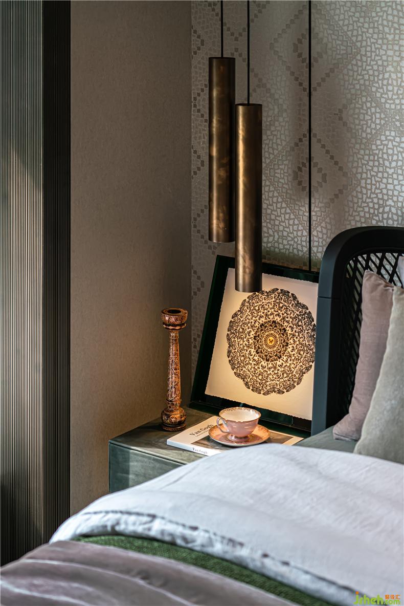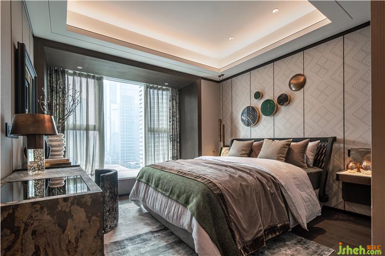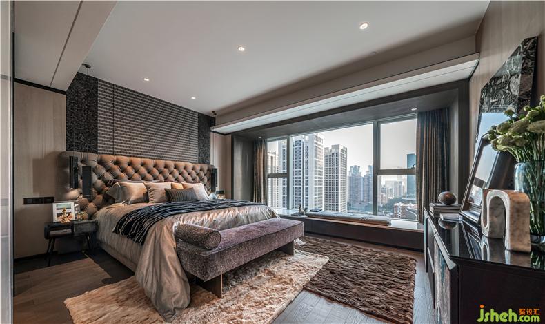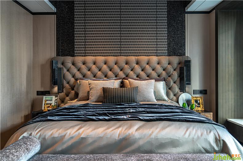 与主卧对应的另一套端头双主卧,有着与主卧相同的中央大街繁华窗景,设计师将窗外的都市景致引入室内空间环境中,搭配灰色沙龙质感墙纸,内外呼应。灵感来自于超现实主义内饰,传达当代时尚轻奢风格.