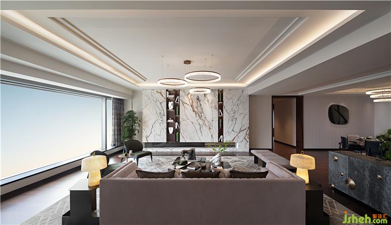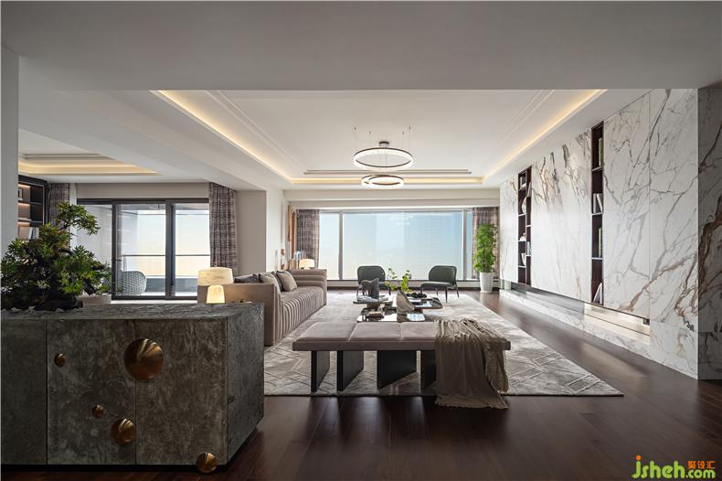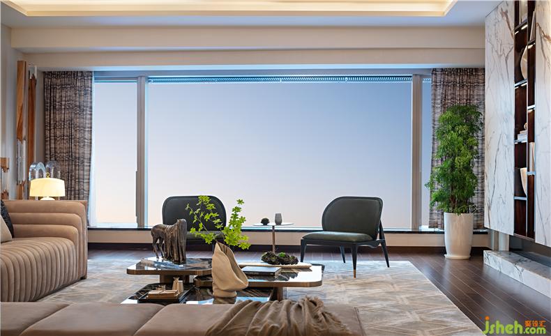 光线,是东方美学空间的重要元素。约383㎡ 的大平层公寓,立于长约13m超宽尺度的窗前,自然光充盈整个身心,Imax视野令人豁然开朗,过往、当下和未来在这里汇聚,静览繁华万象,乘物以游心。样板房设计
