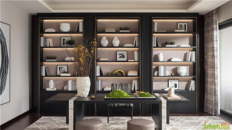 大气非凡的偏厅,营造禅境的空灵与澄净。书架在诗意光影中明暗交织、清隽有致,绿意深覆读书堂,赋予空间独特的审美特质和精神气格。