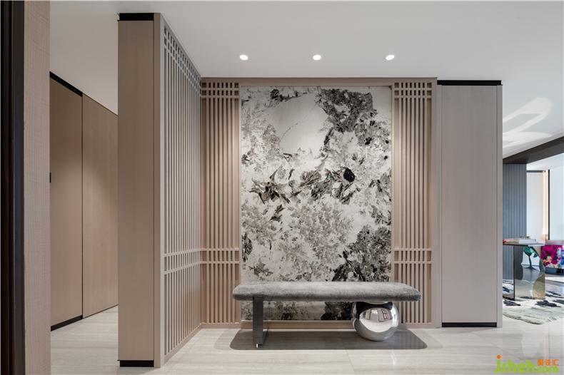 走进‘头号玩家’这套样板空间仿若走进了一个时尚潮玩馆。样板房设计入口玄关处选用格栅搭配高贵亮面特色云石背景墙,营造精致大气、雍容典雅之感,艺廊化的演绎,完美实现会客空间与休憩空间的动静分区