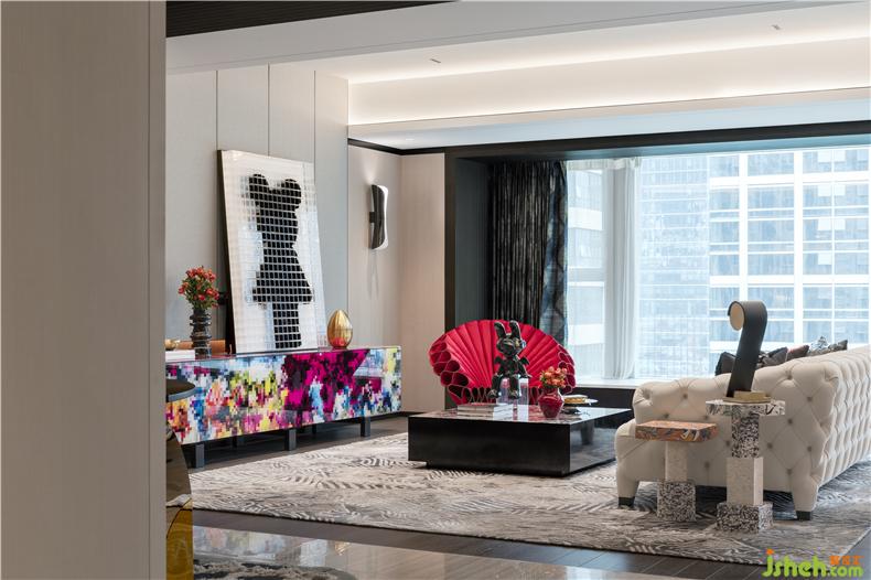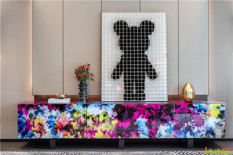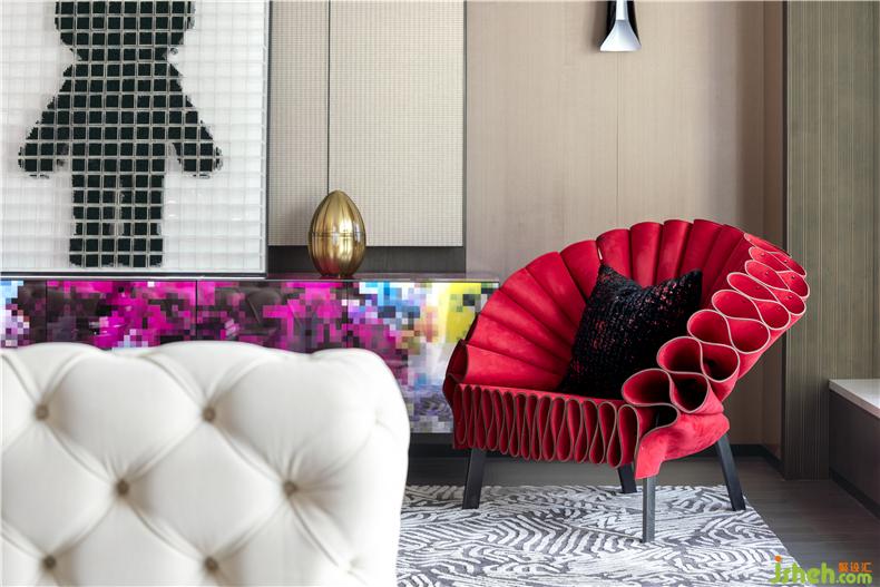 西班牙艺术家具品牌 B.D Barcelona ,以独特前卫的艺术家具享誉全球,客厅中色彩缤纷的梦幻柜(Dreams Cabinet)便是B.D Barcelona 的代表作,其独特的彩色像素设计成为会客厅中艺术品般的存在,与大面积观景窗旁的红色伞形“女王座”,共同为空间注入个性色彩与趣味。