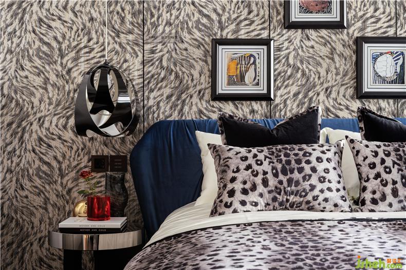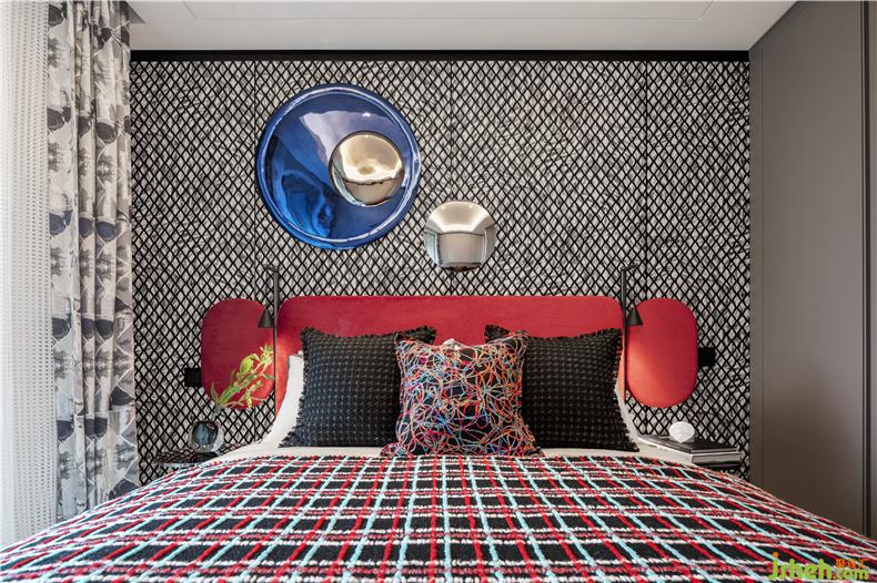 另一套次卧采用红蓝撞色设计,热情与平静的碰撞释放愉悦活力之感。样板房设计圆滑流畅的弧线散布于床头柜、挂饰、床边柜、灯饰,流动而温柔的艺术线条完美勾勒出生活的舒适安逸。