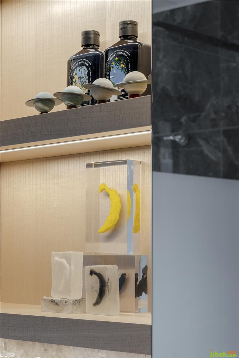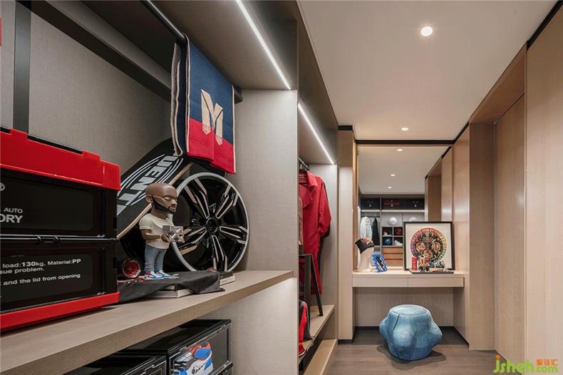 新贵们都是资深的‘时尚客’。他们对衣装绝不盲从,自有一套审美,与此同时,他们的时尚品位又绝不限于衣服鞋品,各类潮流手办亦是当代都会新贵的必收藏品。 设计师将一间大尺度的步入式衣帽间打造成多功能收纳空间,不仅是时装廊,也是都会潮流‘玩家’的手办收藏室,静心贮藏的服饰与藏品,陈列规整,便于挑选与鉴赏。