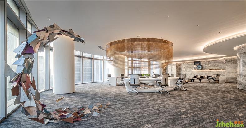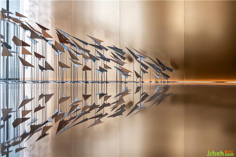 接待台另一侧的飞机主题装置艺术《TAKE OFF起飞》,寓意了城市繁忙向上的商务精神。艺术品描绘的是深圳国际机场每天繁忙而有序的起落节奏,为这个国际大都会带来繁荣的商务往来,欣欣向荣的深圳国际大都会,每一天都在发生新的变化。