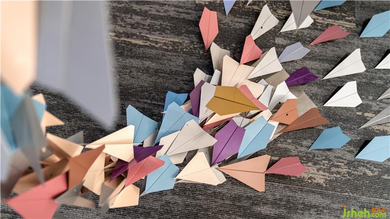 同系列另一组飞机主题装置艺术,放置在开放办公区,色彩呈现更加丰富,造型呈以弯月之势,众多架纸飞机自地面向上聚拢而起,寓义“九层之台,起于垒土”,每一步的努力都是向上的阶梯。