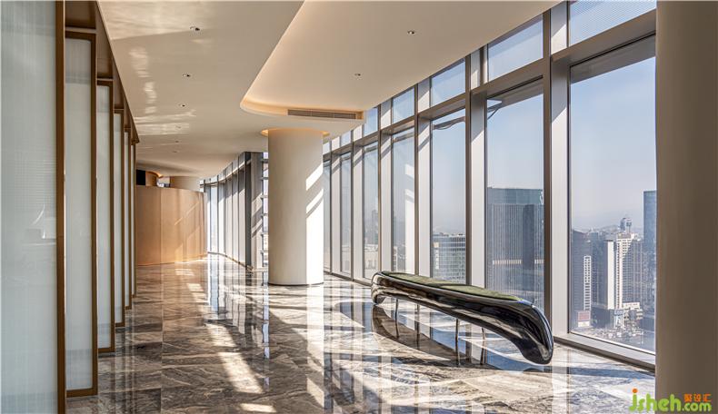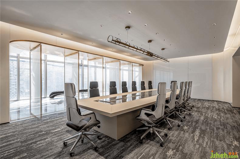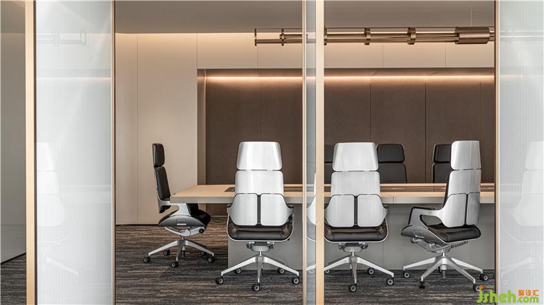 作为顶级商务空间的办公设计,一切都以高效为前提,会议室整体犹以白色墙面为主调,淡金色为点缀,以灰色地毯将整个场景的气息沉稳收敛。空间干净、整洁、令人平心静气,高效办公,呈现出“少即是多”的留白空间美感。