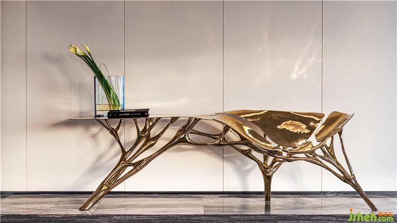 独特造型的艺术桌案,源于艺术家探索物质金属的固态和液态转换。在坚硬的外壳下用手工敲打塑形熔化成如水般状态,然而瞬间又能凝 固成无比坚硬的固态。水滴的形态仿如沿着玻璃桌面流向地面,造成一种重力的错觉感办公室设计。